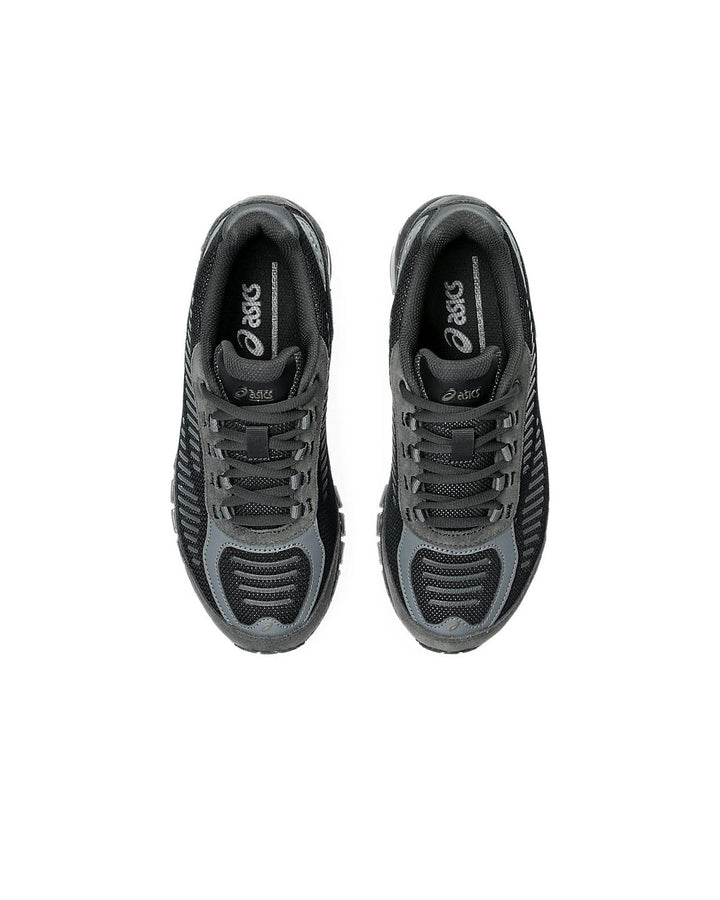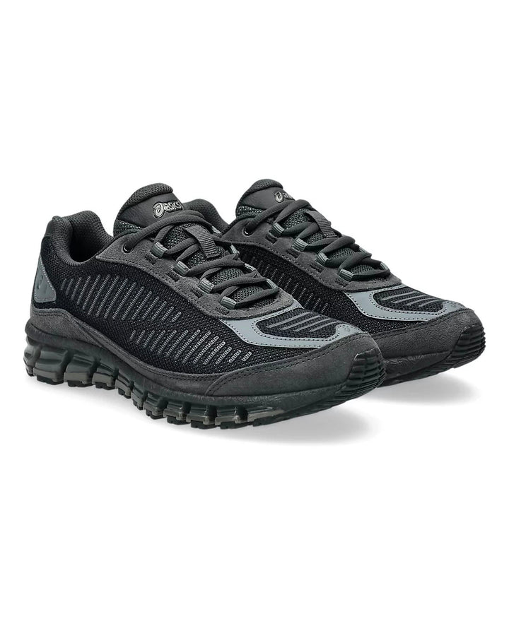 アッパーはブラックのクローズドメッシュを基に、補強パーツにはグラファイトグレーのスウェードを重ね、無骨な印象をプラス。テクニカルな印象を与える360°"GEL"もブラックで染め上げて、ソリッドで力強い足元を演出している。