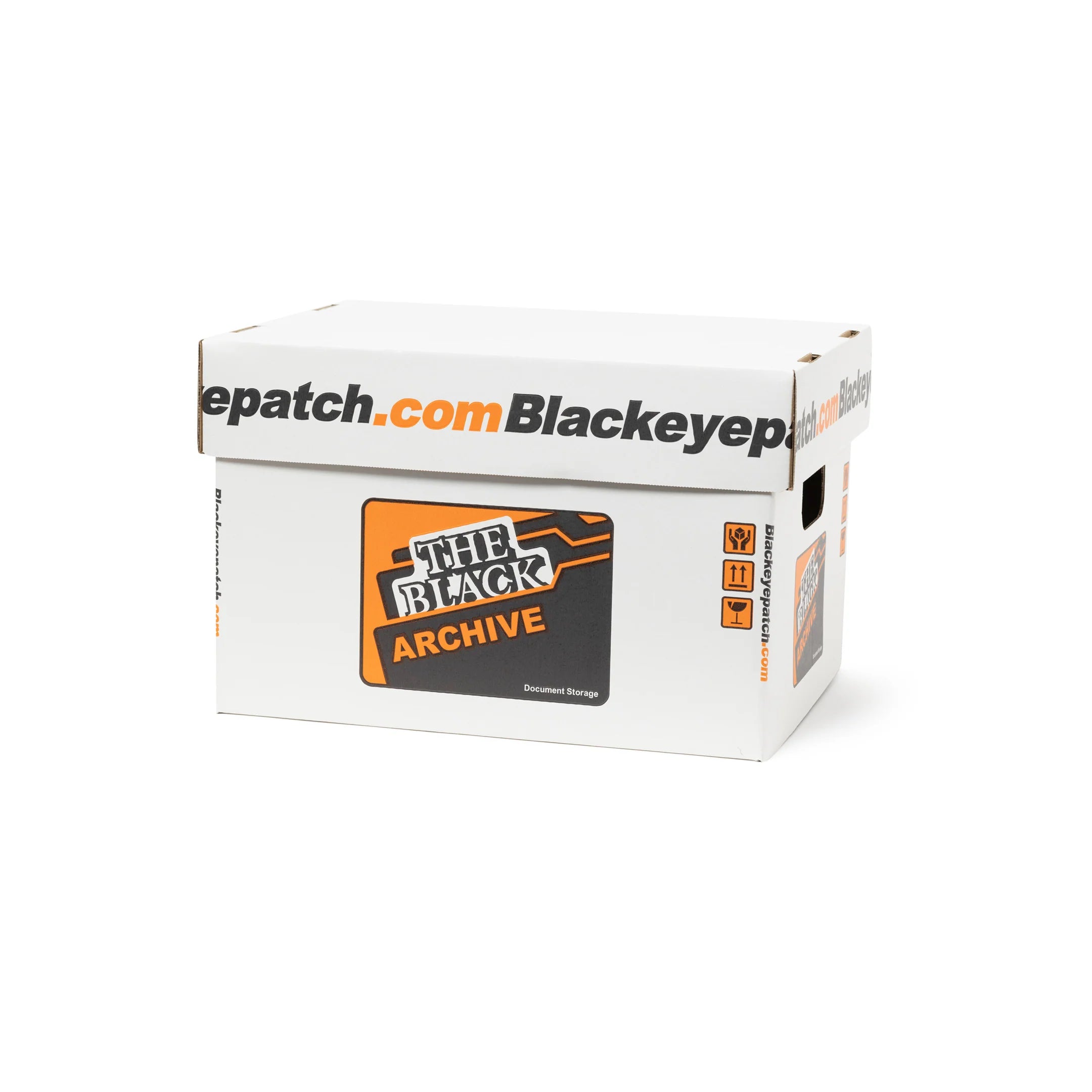Black Eye Patchのデザインアイデンティティである「ラベル」や「業務用ステッカー」のデザインを落とし込んだA4サイズの段ボール製BOX。