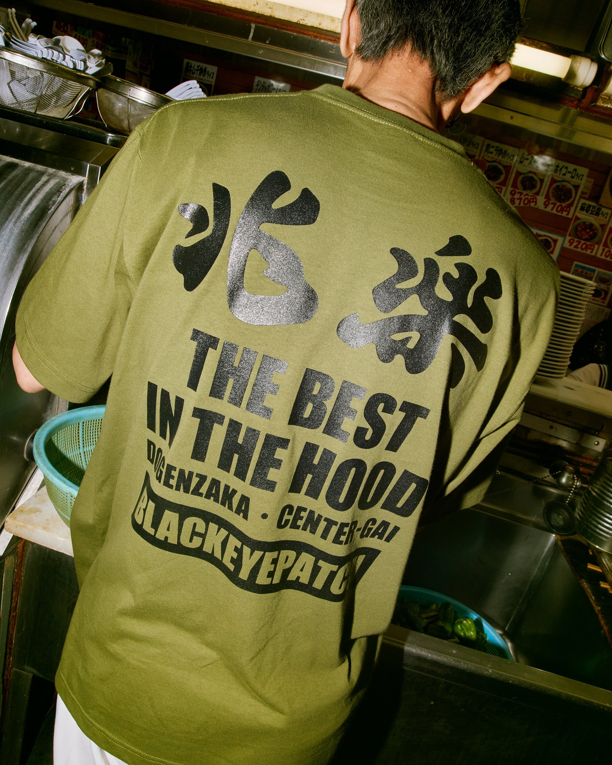 Collaboration T-shirt with "Choraku," a long-established Chinese restaurant in Shibuya, with the typography "THE BEST IN THE HOOD" printed on the back.