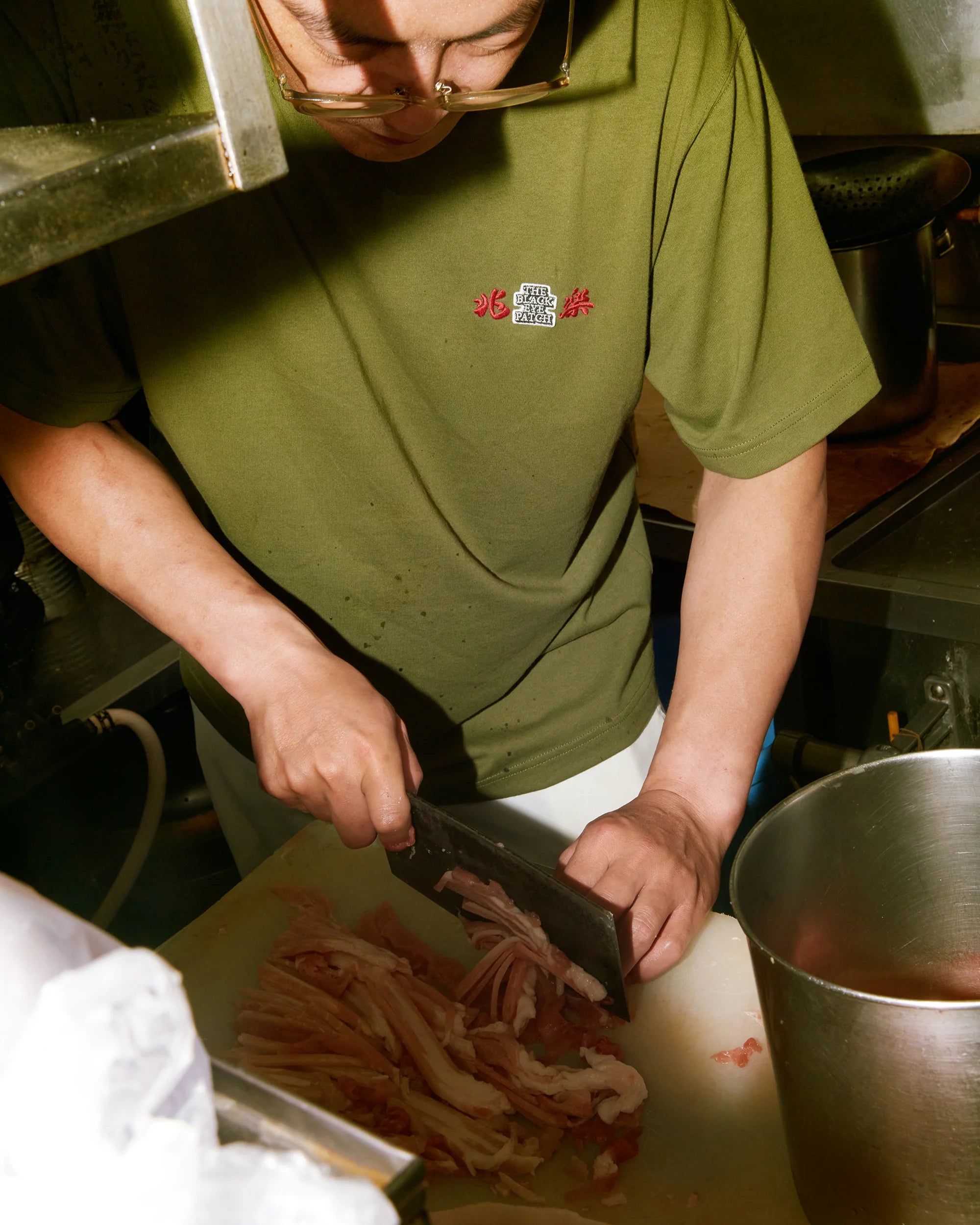 バックに "THE BEST IN THE HOOD(兆楽がフッドで一番美味い)" のタイポグラフィをプリントした渋谷の老舗中華料理屋「兆楽」とのコラボ T シャツ。