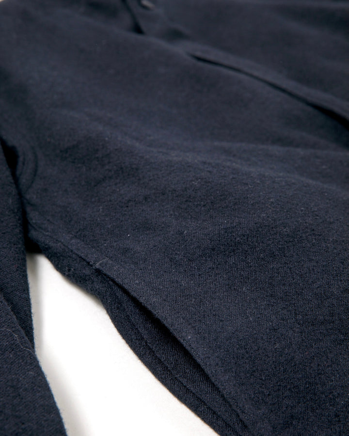 2/60の梳毛を使用した、縮絨ウール。こちらは縮絨加工で膨らみを出すために若干甘めに尾州産地で丁寧に織り上げています。通常の縮絨加工よりも、繊維間の空間を多くつくることのできるリファイン加工を施すことで、ボリューム感のある見た目に反して、軽く仕上がっているのが特徴です。