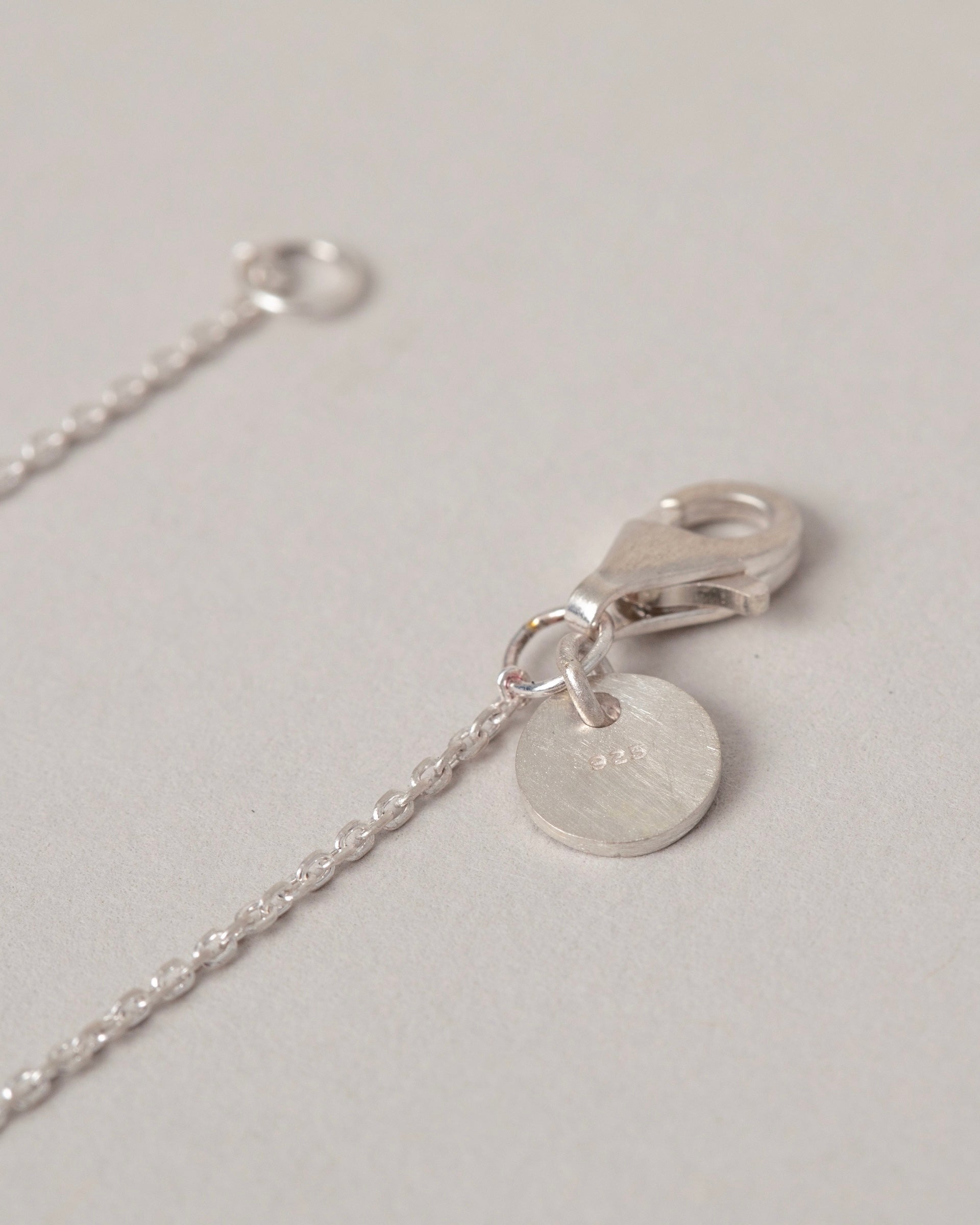 含有率92.5%のいわゆる純銀を使用しています。 繊細なあずきタイプのチェーンで作ったミニマルなネックレス。スタイル、性別、TPO問わずつけていただけます。他のブレスレットや腕時計と合わせてつけられるミニマルさが魅力。