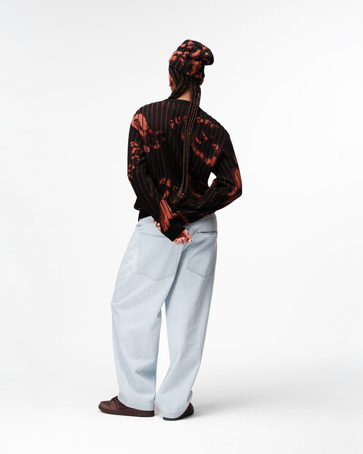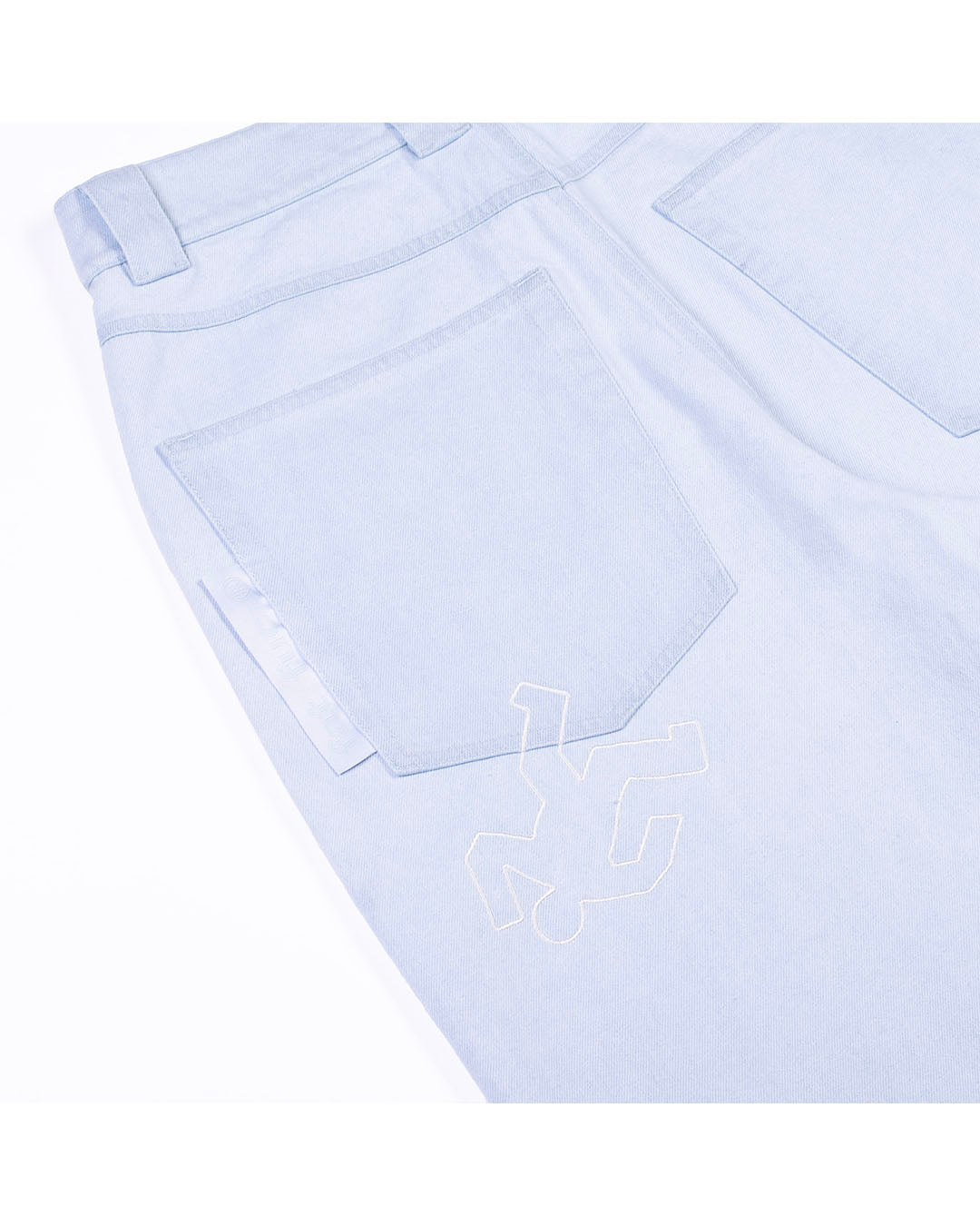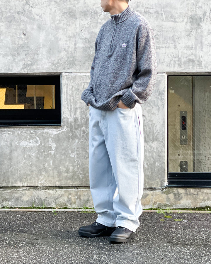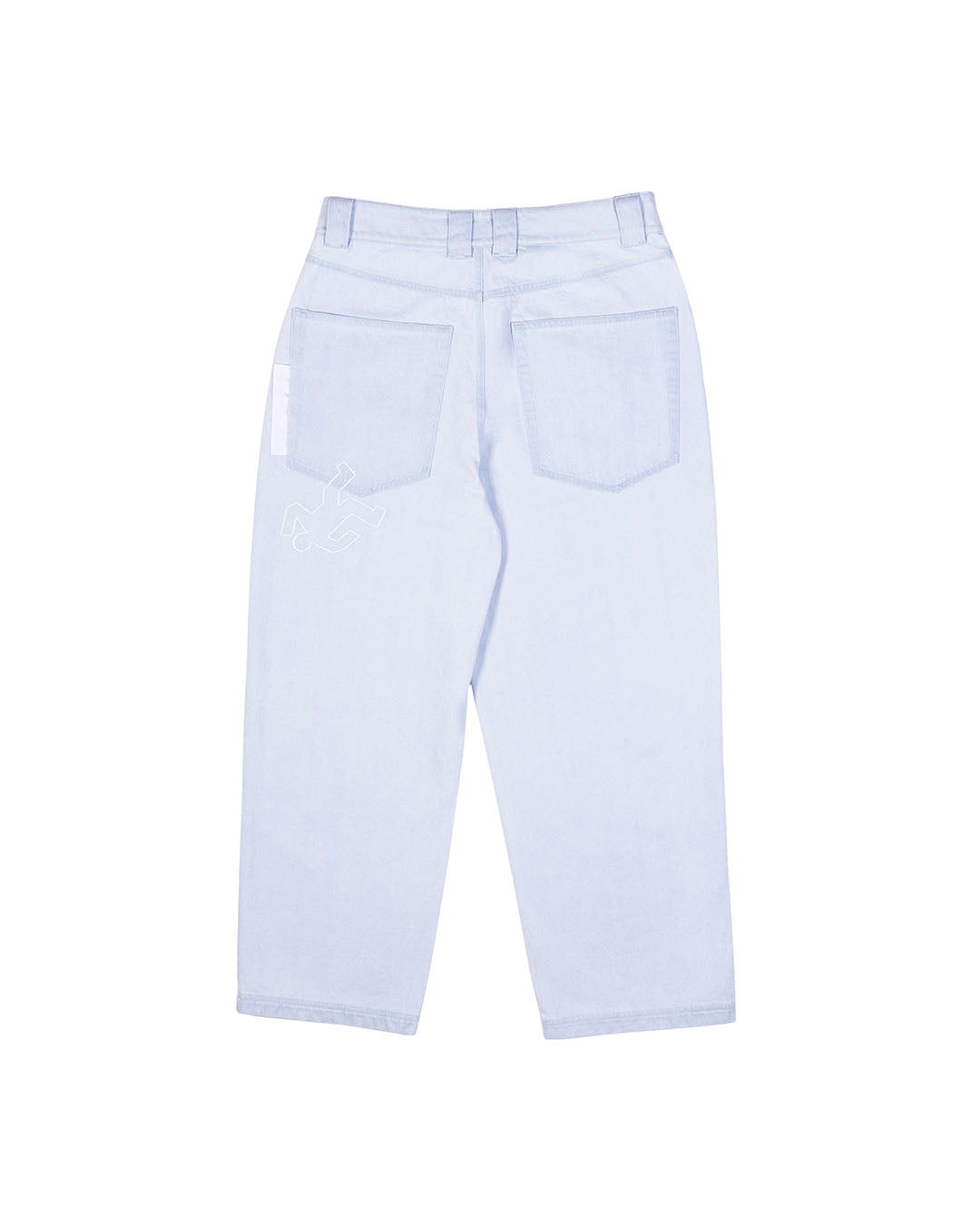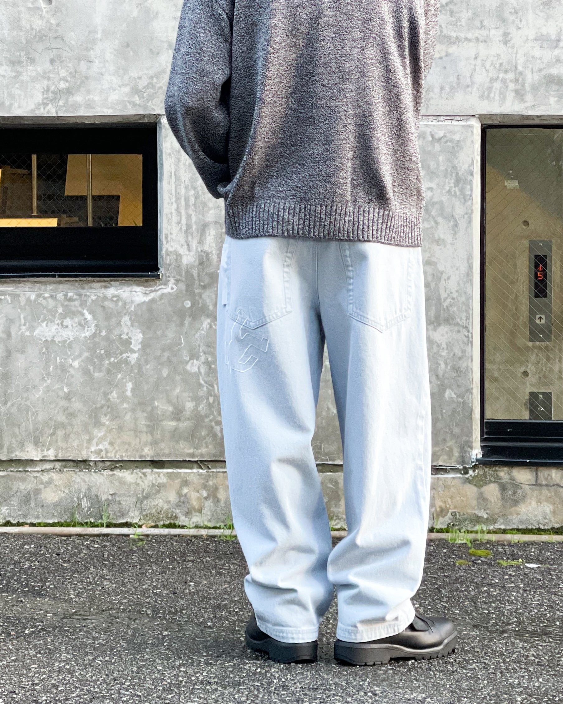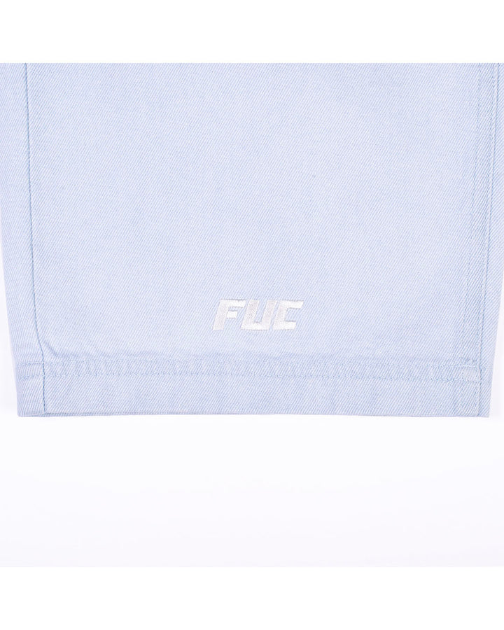 ブランド定番FAT FUC JEANSの新作。ウオッシュがしっかり効いたアイスブルーのボディにバックポケットにピスラベル、人型モチーフの刺繍入りデザイン。右脚裾部分にFUC刺繍ロゴ入りのデザイン。