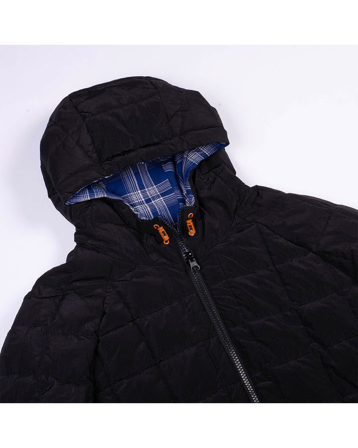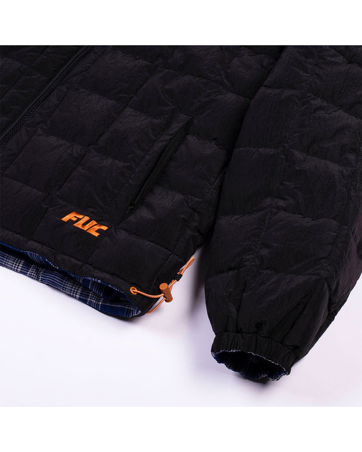 クラシカルなチェック柄とブラックナイロンの両A面リバーシブル仕様のパフジャケット。裾やフード部分にドローコード付きで調整可能。フランネル×ナイロンの切り替えや、オレンジのFUC刺繍ロゴも良いアクセントになっています。