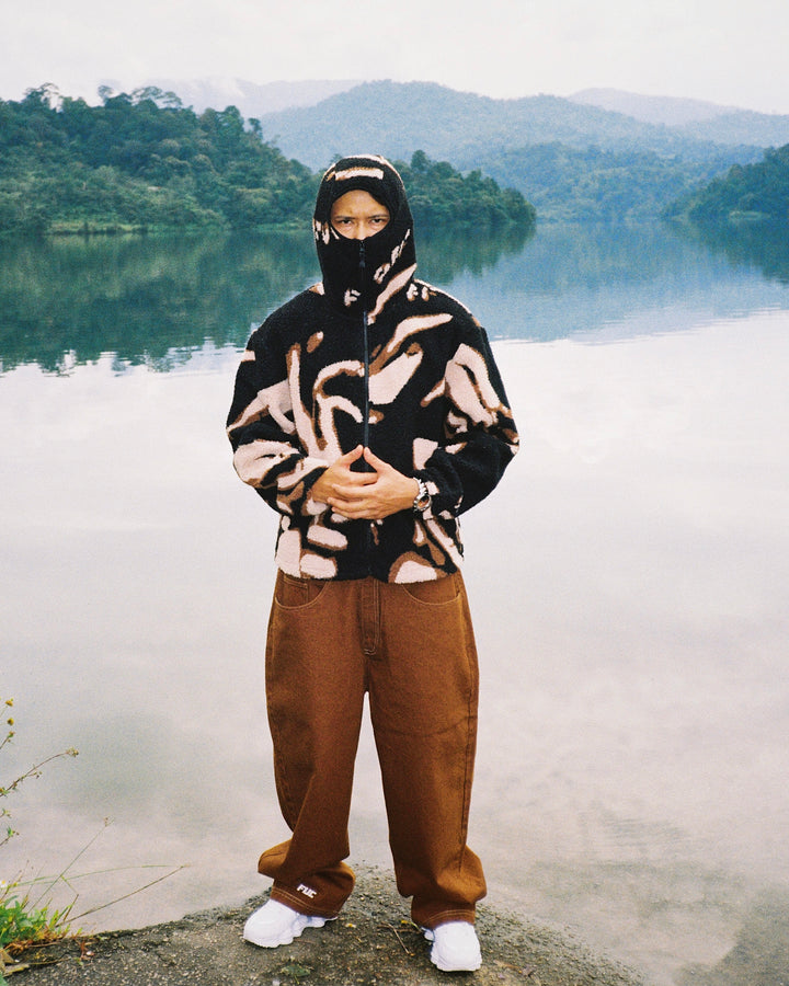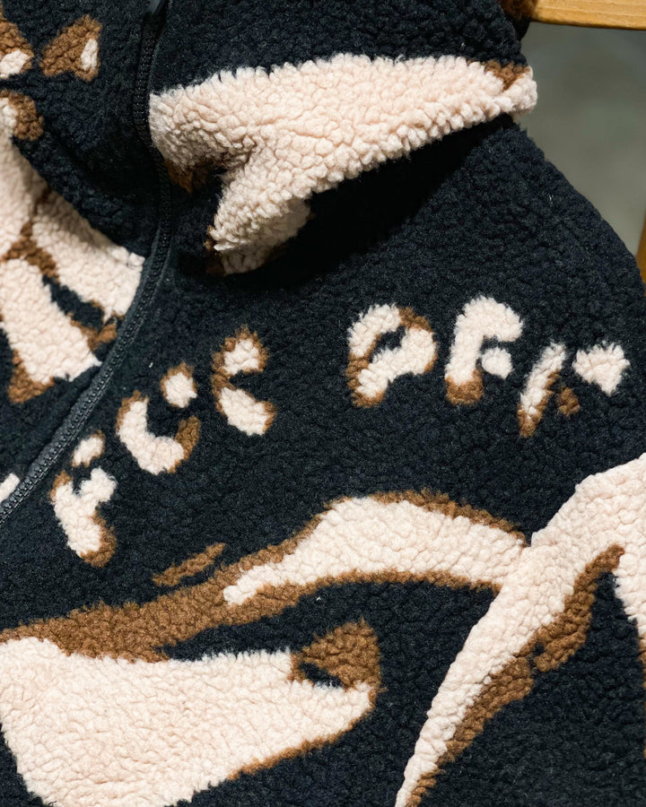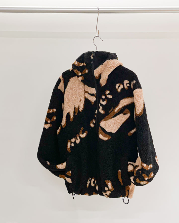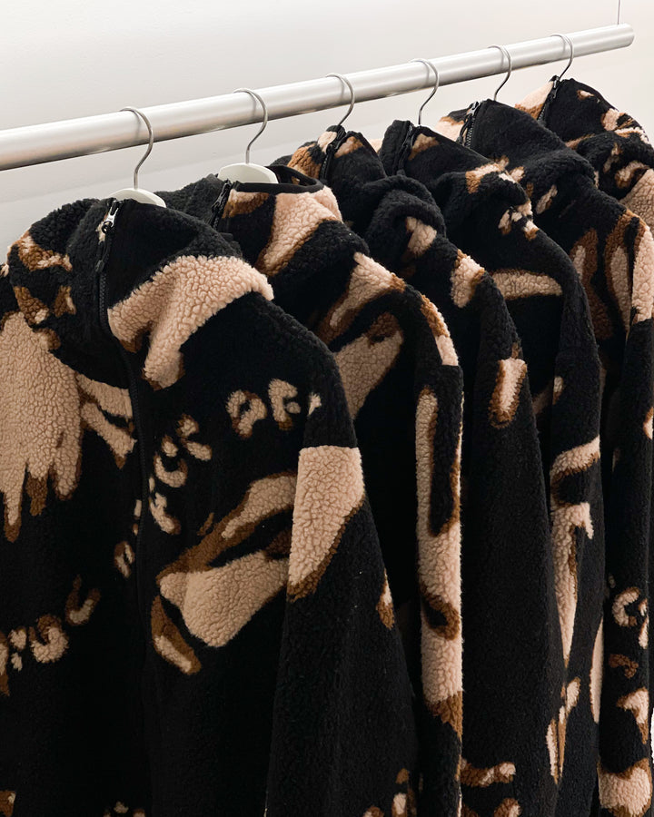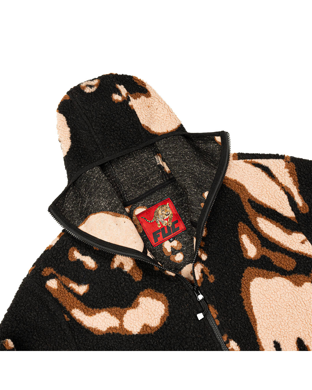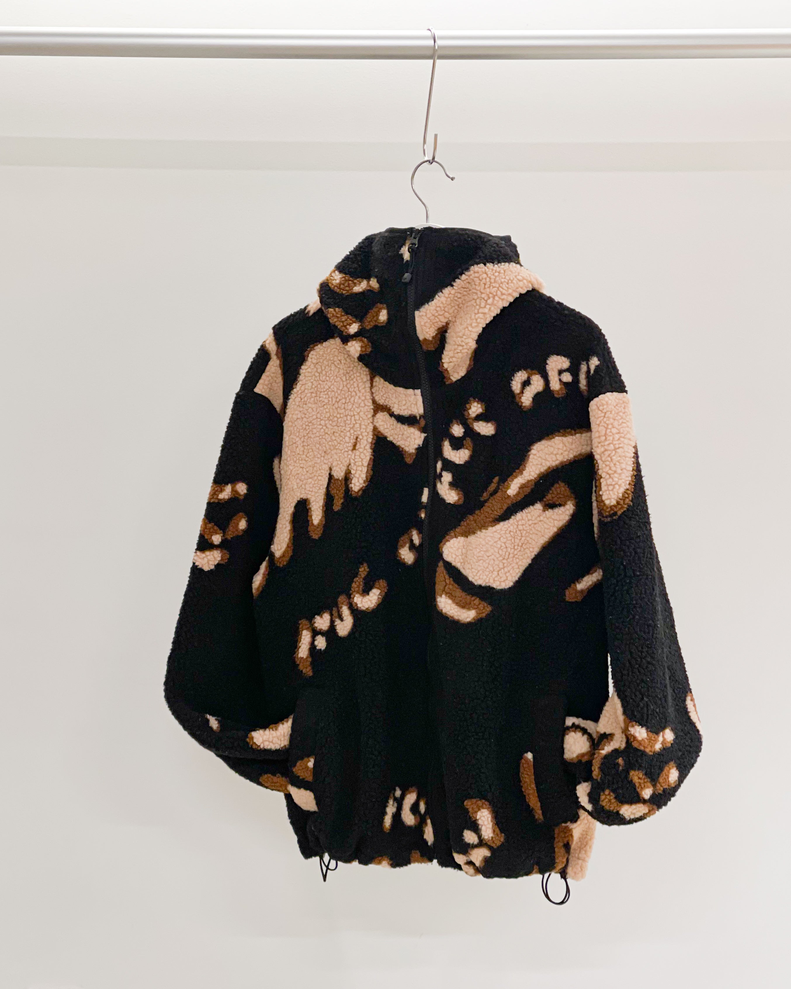 インパクト大の"FUC OFF"モチーフの総柄デザインが目を惹くジップアップのボアフリースジャケット。フロントジップは高めの位置設定になっており、フードを被るとバラクラバのようなテンションで使える仕様に。この時期から春先までしっかり活躍する一着です。