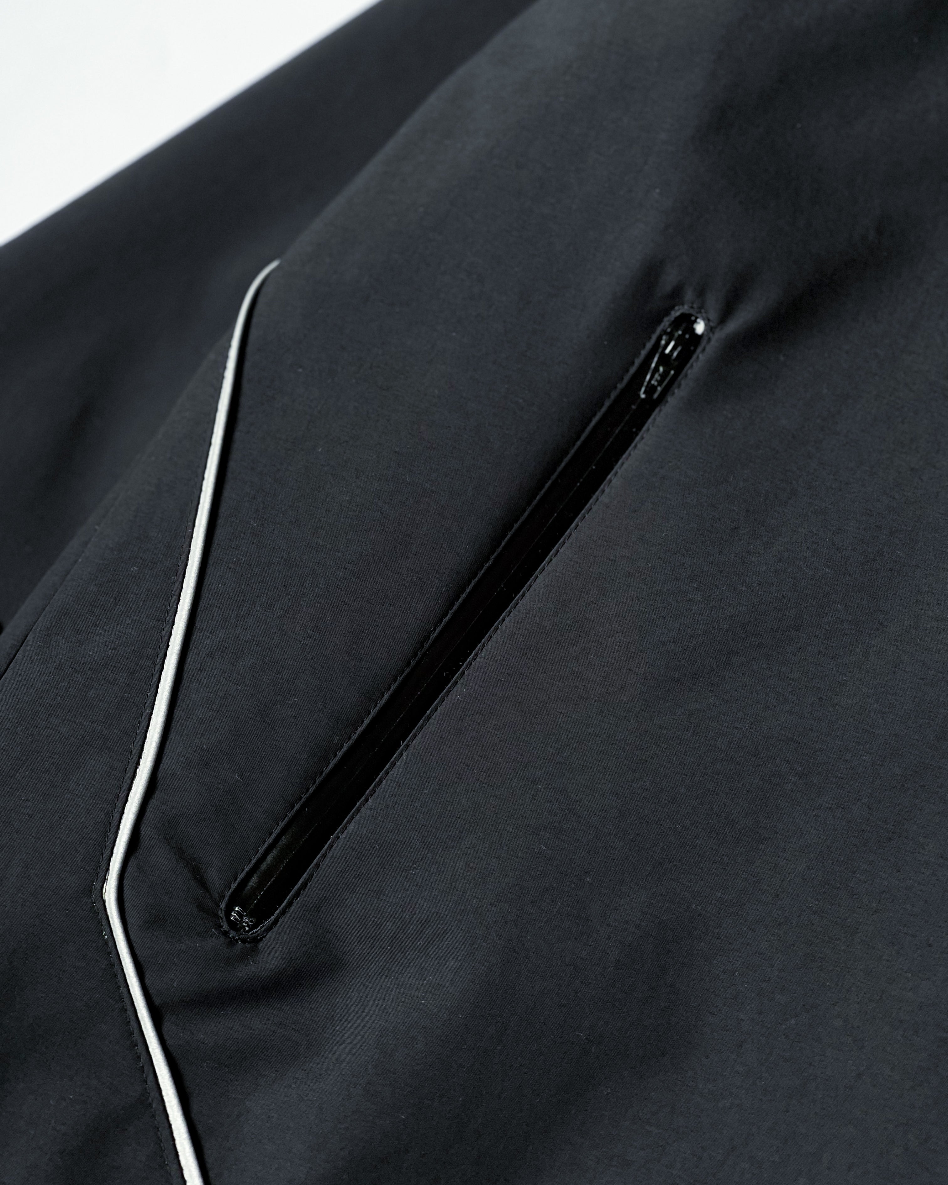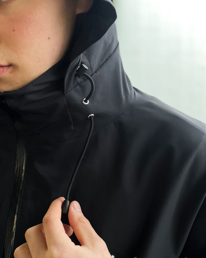 止水ジップを使用したポケットやフロントファスナー、フード部分に付けられたドローコードなどシェルジャケットに欠かせない機能的な部分は残しつつも、裾にはアジャスターを配置せず体に沿うようにラウンドにカット。