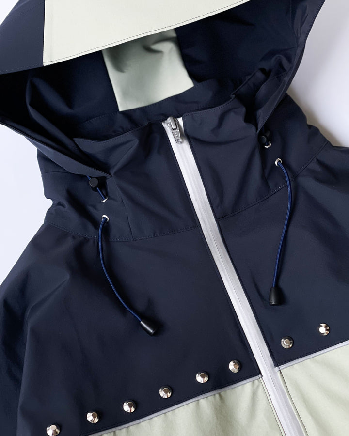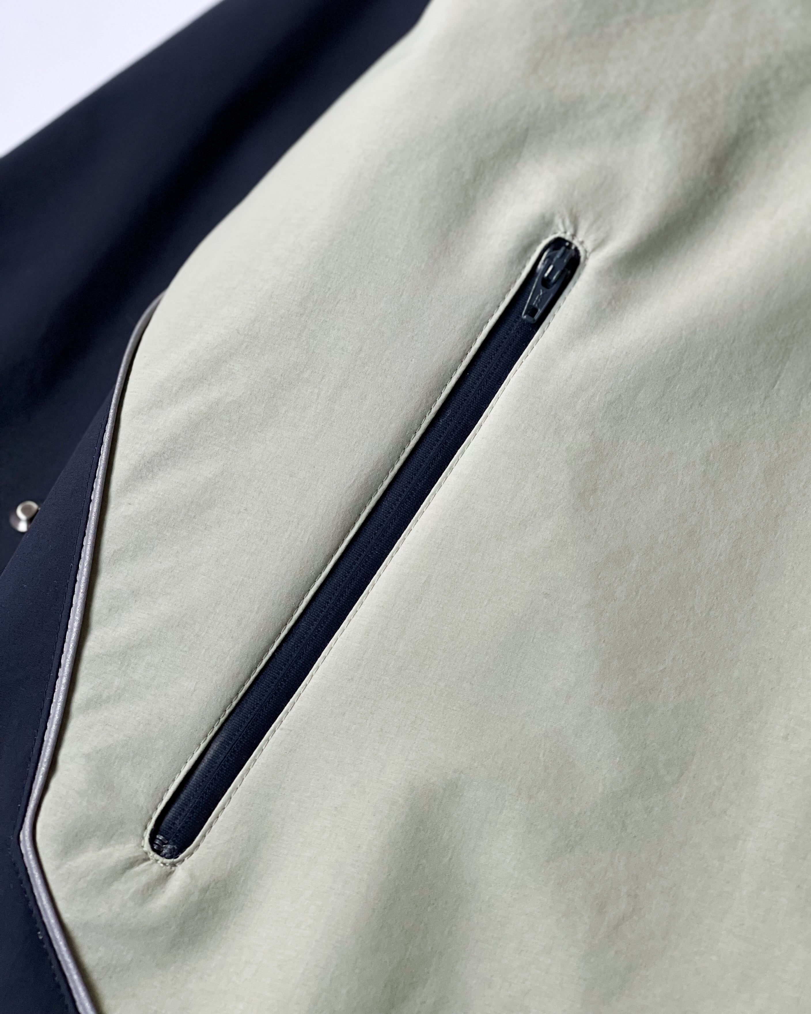 止水ジップを使用したポケットやフロントファスナー、フード部分に付けられたドローコードなどシェルジャケットに欠かせない機能的な部分は残しつつも、裾にはアジャスターを配置せず体に沿うようにラウンドにカット。