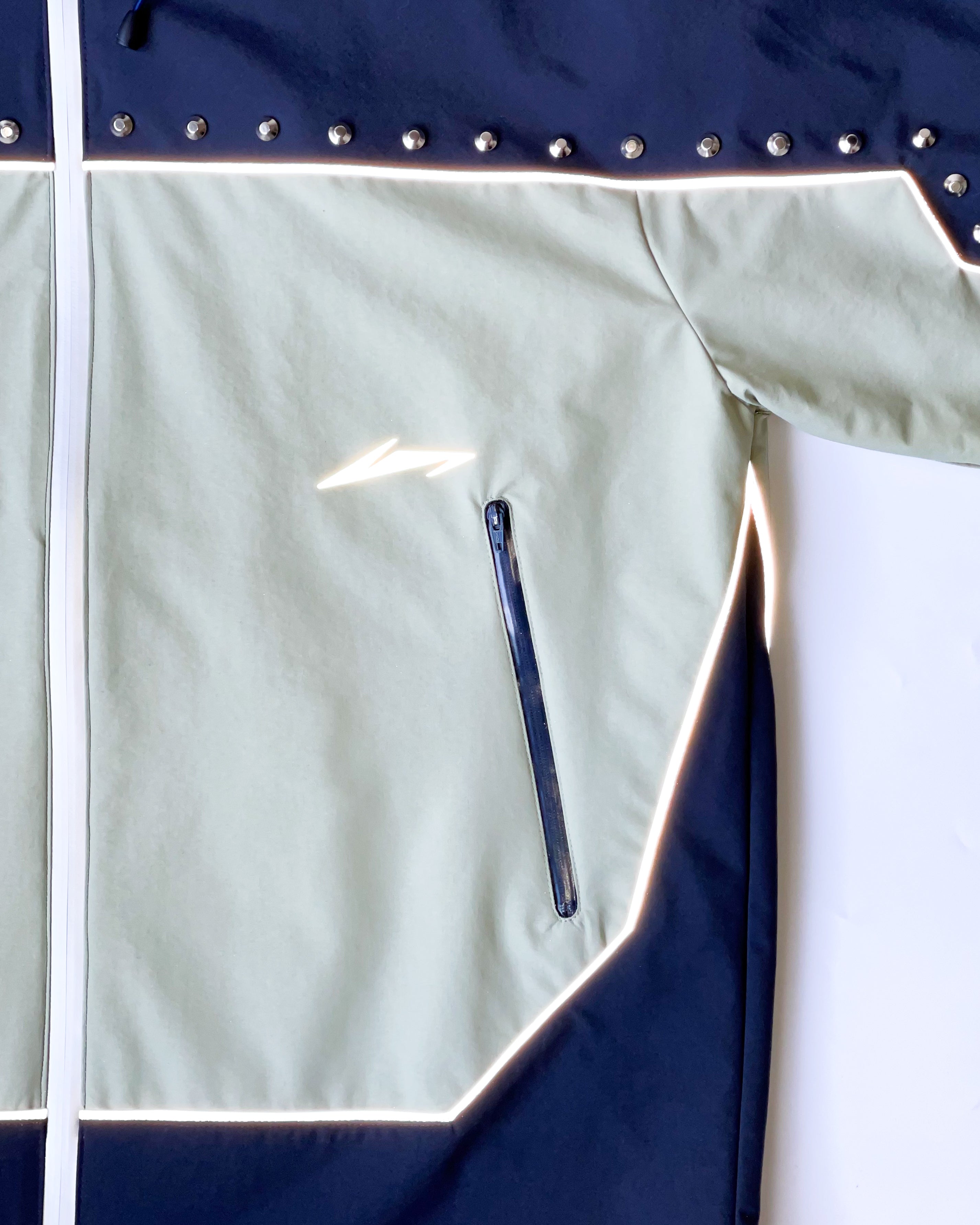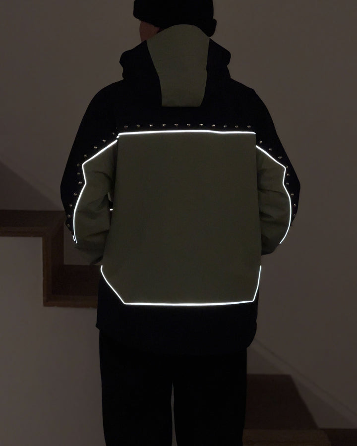 体を覆うように配置されたスタッズやリフレクターパイピングなどice&technoらしいエッジが効いた一着。