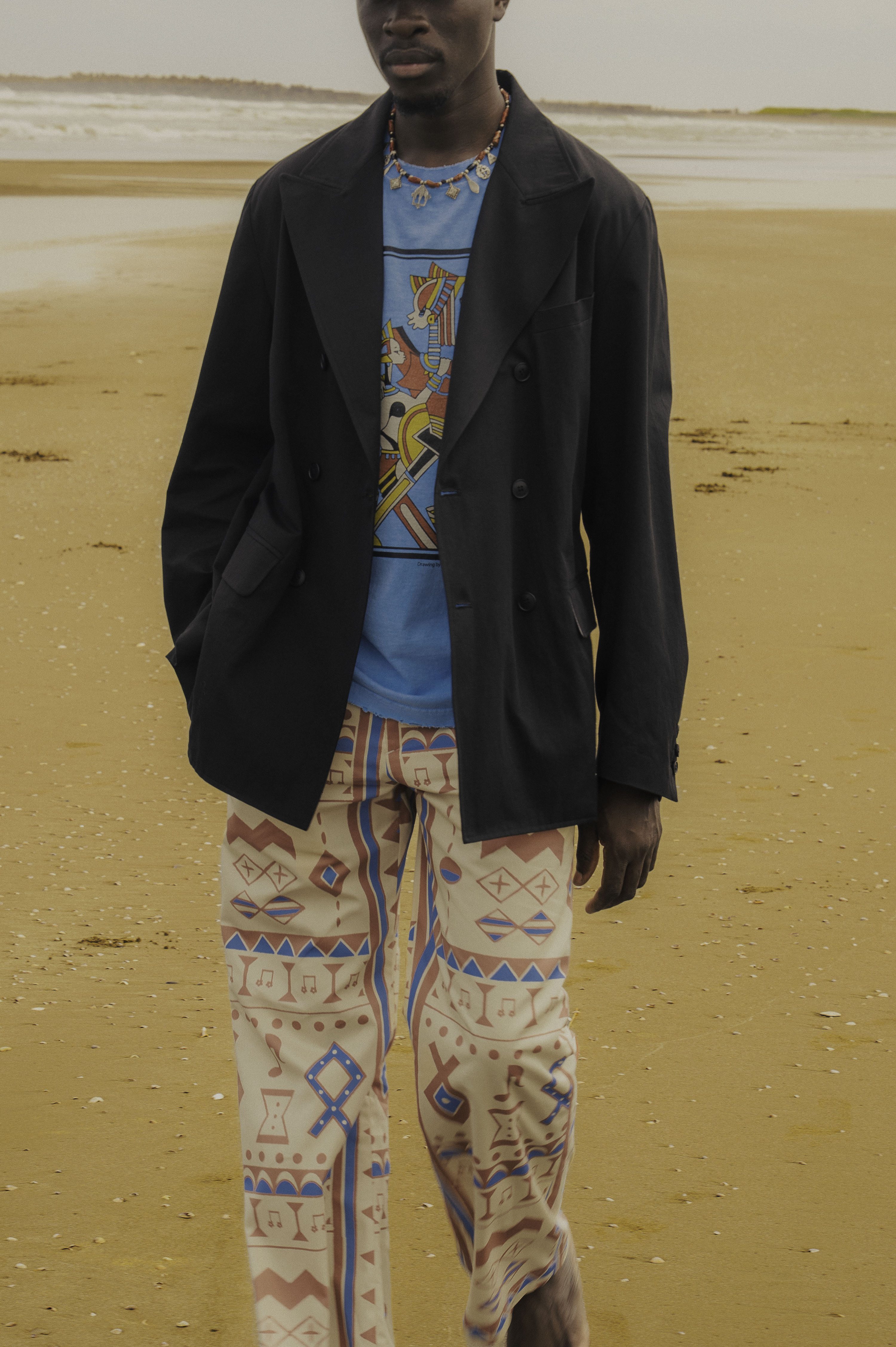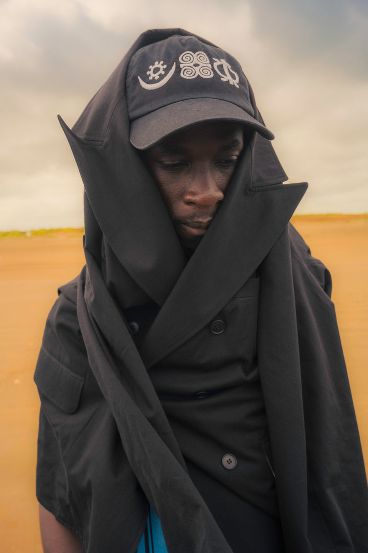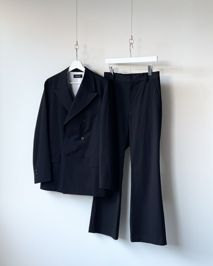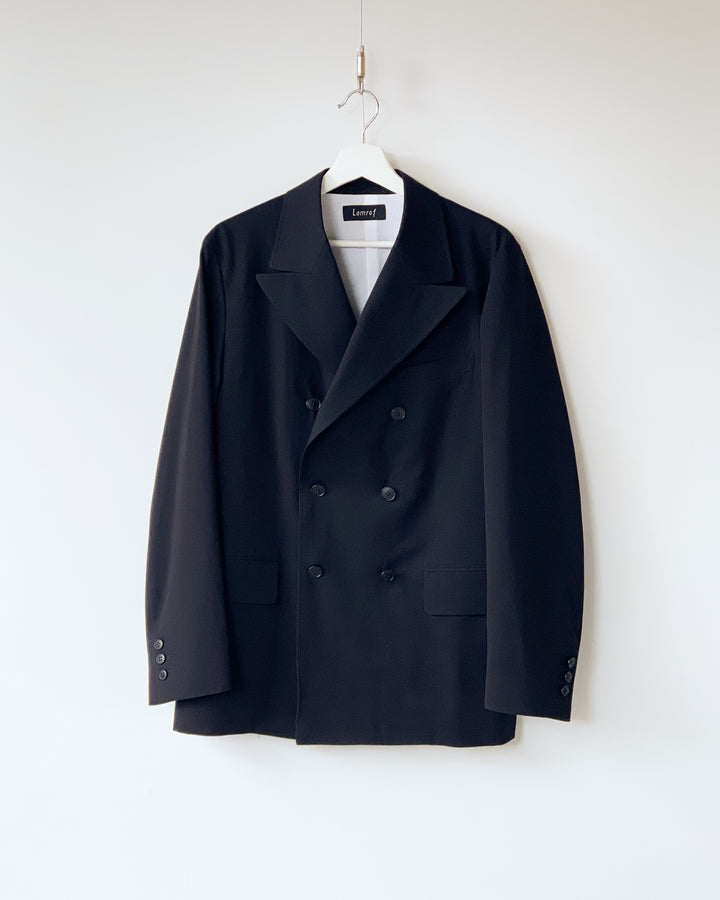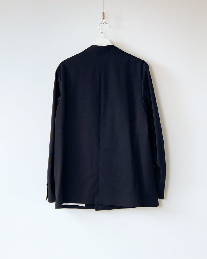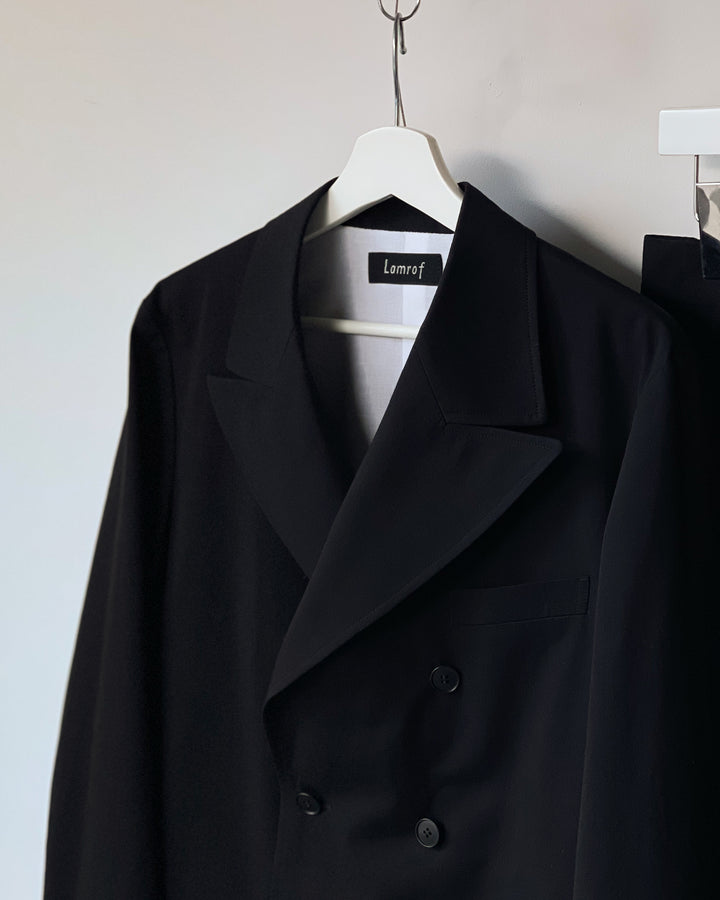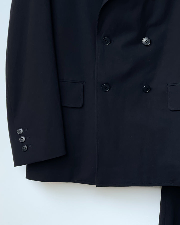 ジャズアーティストのブラックスーツの装いからインスパイアし製作した、上品な表情と季節を問わない実用性を両立した高密度なコットンリネンツイル素材で仕立てたダブルジャケット。経糸は表面の毛羽をガス焼きしたコットン、緯糸にはリネンの混紡糸を使用して素材の奥行きが感じられる生地構造で組み、洗いと揉み込みの工程を組み合わせることで高密度素材の反発感は残しながら膨らみと柔らかさを引き出して使用。肩は落とさず立体的なアウトラインと前振りの袖付けで組んだベースパターンと、国内のテーラーによる部分的に手縫いを含んだ縫製によってリラックスしたサイズバランスとシャープなルックスのバランスを構築。ブランドのアイデンティティを日常に落とし込んだマスターピースとしての1枚。