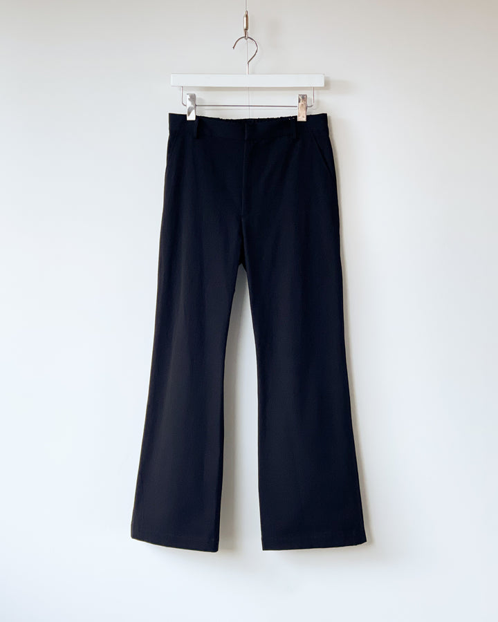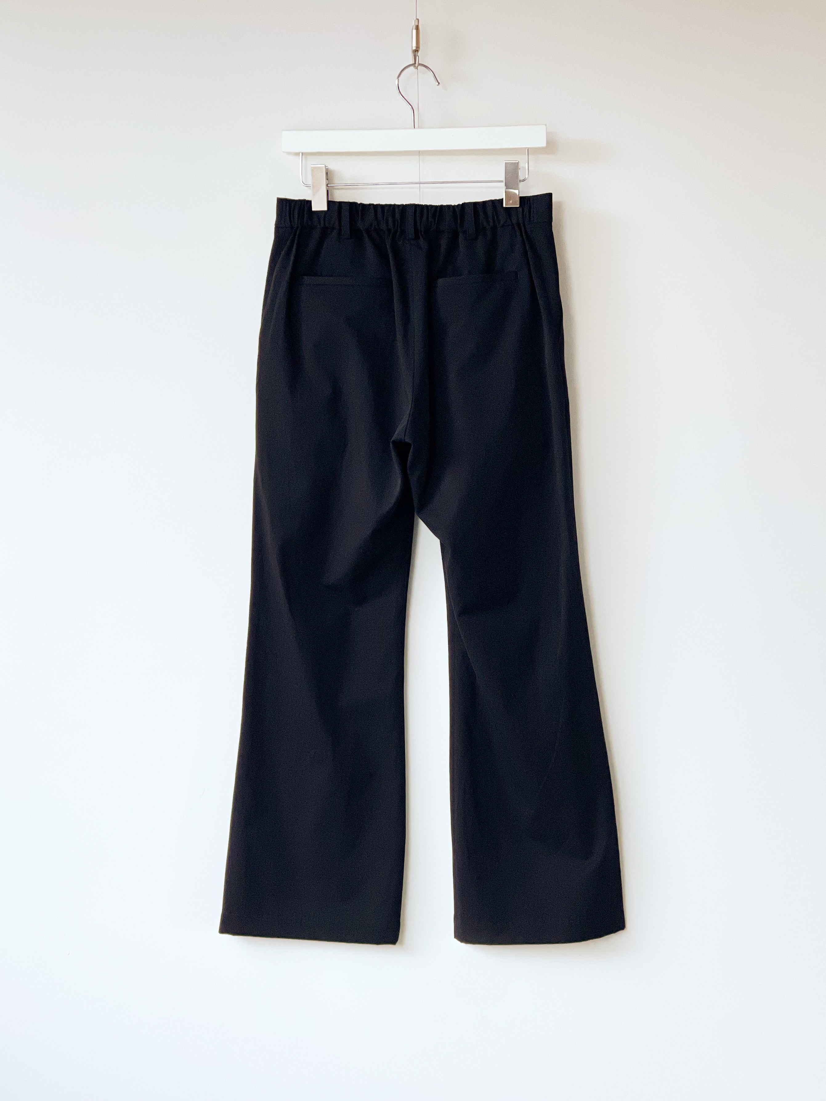 ジャズアーティストのブラックスーツの装いからインスパイアし製作した、上品な表情と季節を問わない実用性を両立した高密度なコットンリネンツイル素材で仕立てたセミフレアスラックス。経糸は表面の毛羽をガス焼きしたコットン、緯糸にはリネンの混紡糸を使用して素材の奥行きが感じられる生地構造で組み、洗いと揉み込みの工程を組み合わせることで高密度素材の反発感は残しながら膨らみと柔らかさを引き出して使用。ブランドの定番として製作していたセミフレアシルエットをより日常の動作や装いに合わせアップデートしたサイズバランスとアウトラインが特徴。セットアップはもちろん、単品でも全てのアイテムに対応する本コレクションにおけるマスターピース。国内のスラックス工場で仕立てたカジュアルに着用出来る仕様でありながら着用時の印象は本格的なスラックスルックとなる完成度。