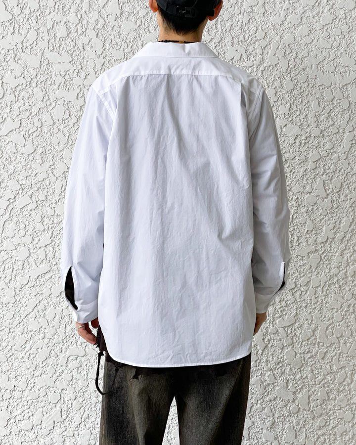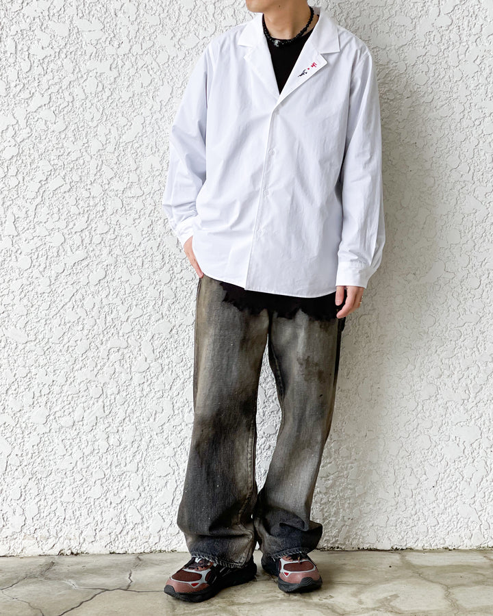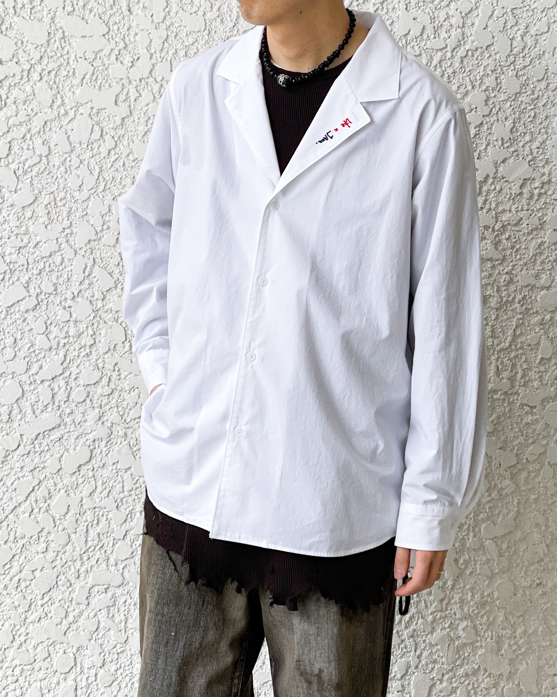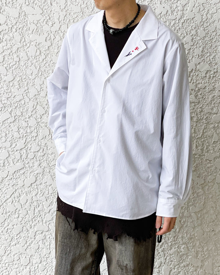 開襟シャツとテーラードジャケットの要素を掛け合わせた品のある衿型が特徴。春から初夏まではジャケットのインナーや1枚着として、真夏時期には羽織として活躍します。衿フロントにドローイングした今季のテーマLike a Jazzを2色の特殊刺繍で表現。生地は洗いのかかったホワイトブロード。