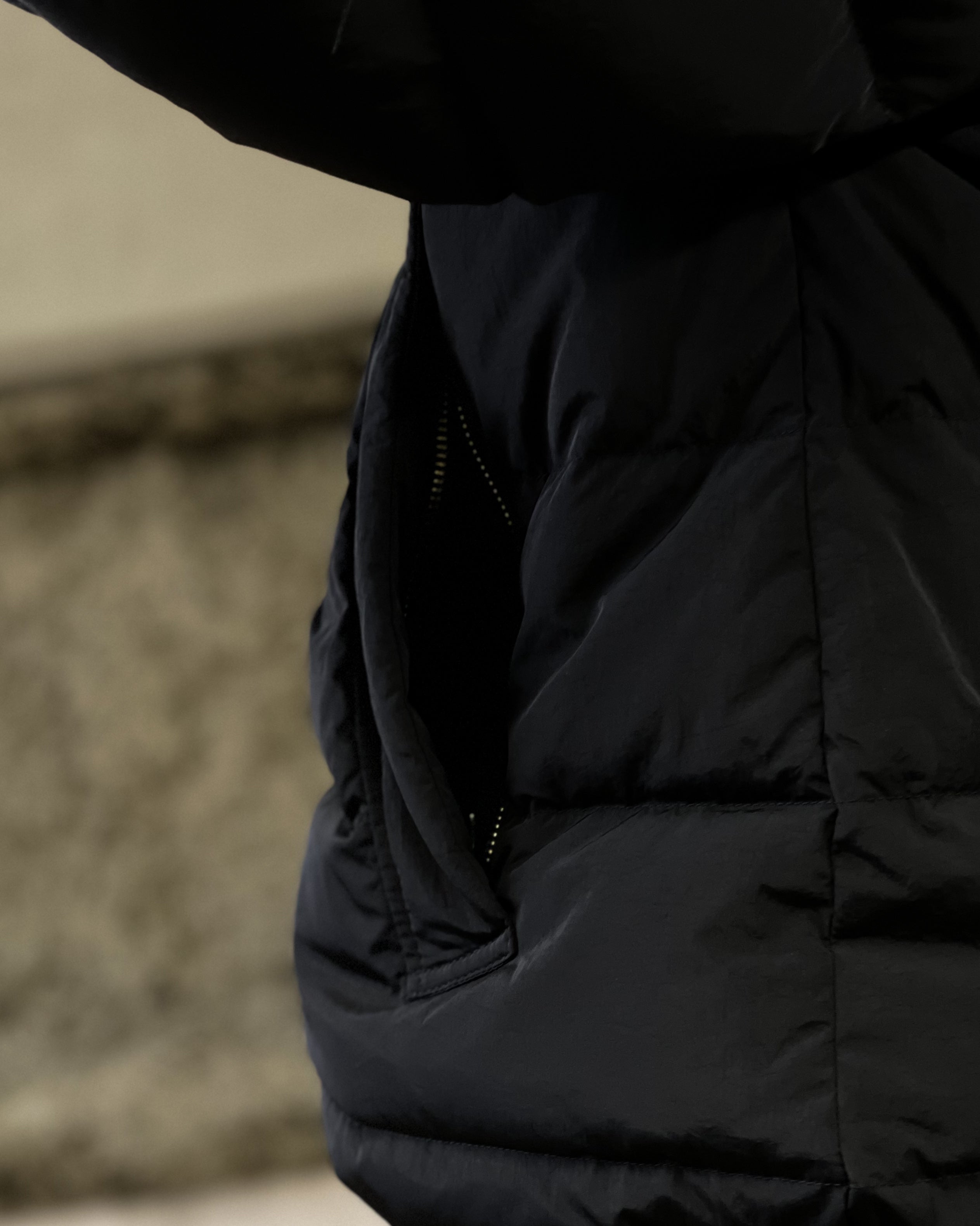 フロントハーフジップ / 3ボタンのアノラックシルエットのダウンジャケットとなります。