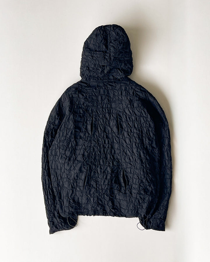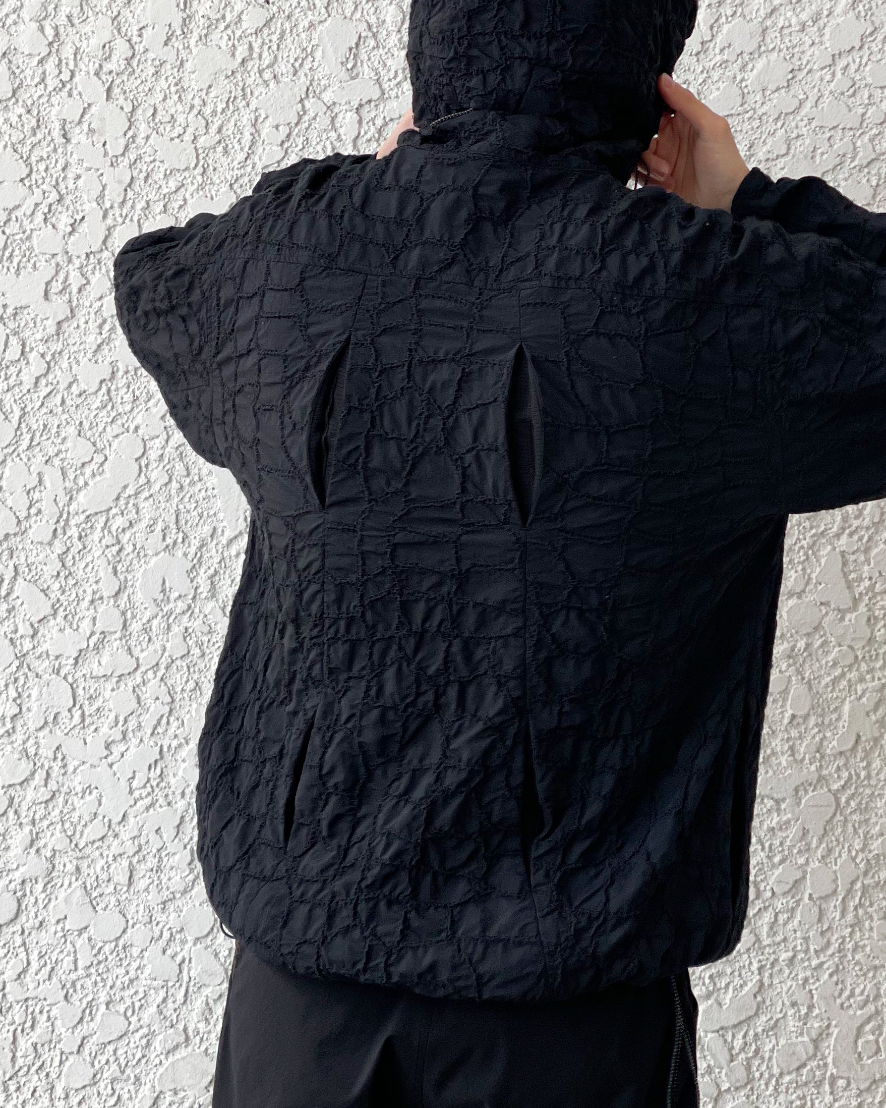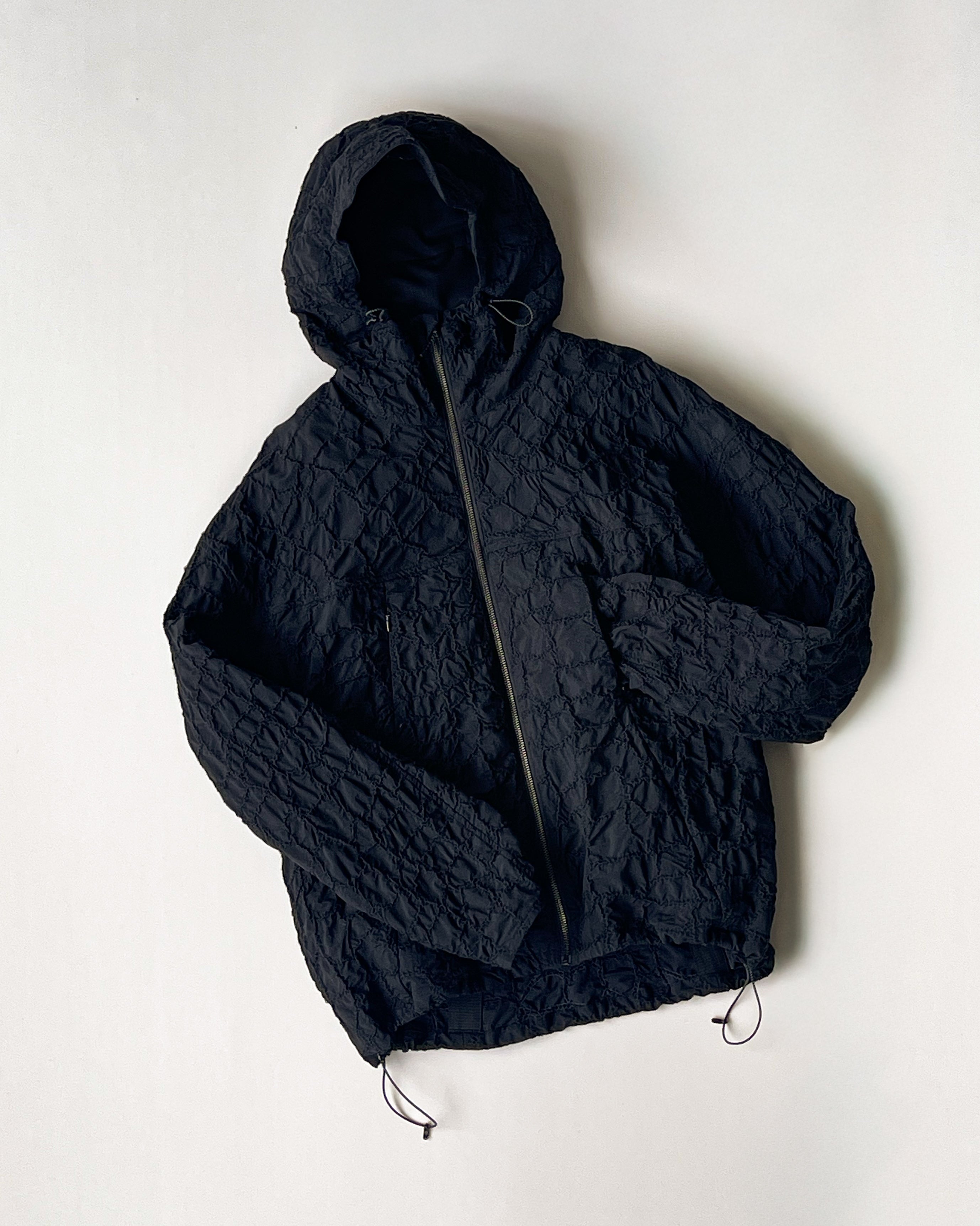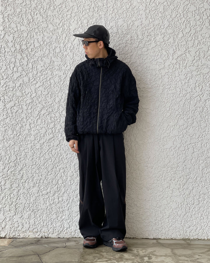 湿度の高い日本で長く着用出来るように透湿性、軽量性に長けたリサイクルナイロン生地に全面刺繍を施した軽量シェルジャケット。胸にはデザインを邪魔しないコンシールポケット。バックには動きに合わせて開くベンチレーションポイント付き。裾やフード部分のドローコードで調整可能。