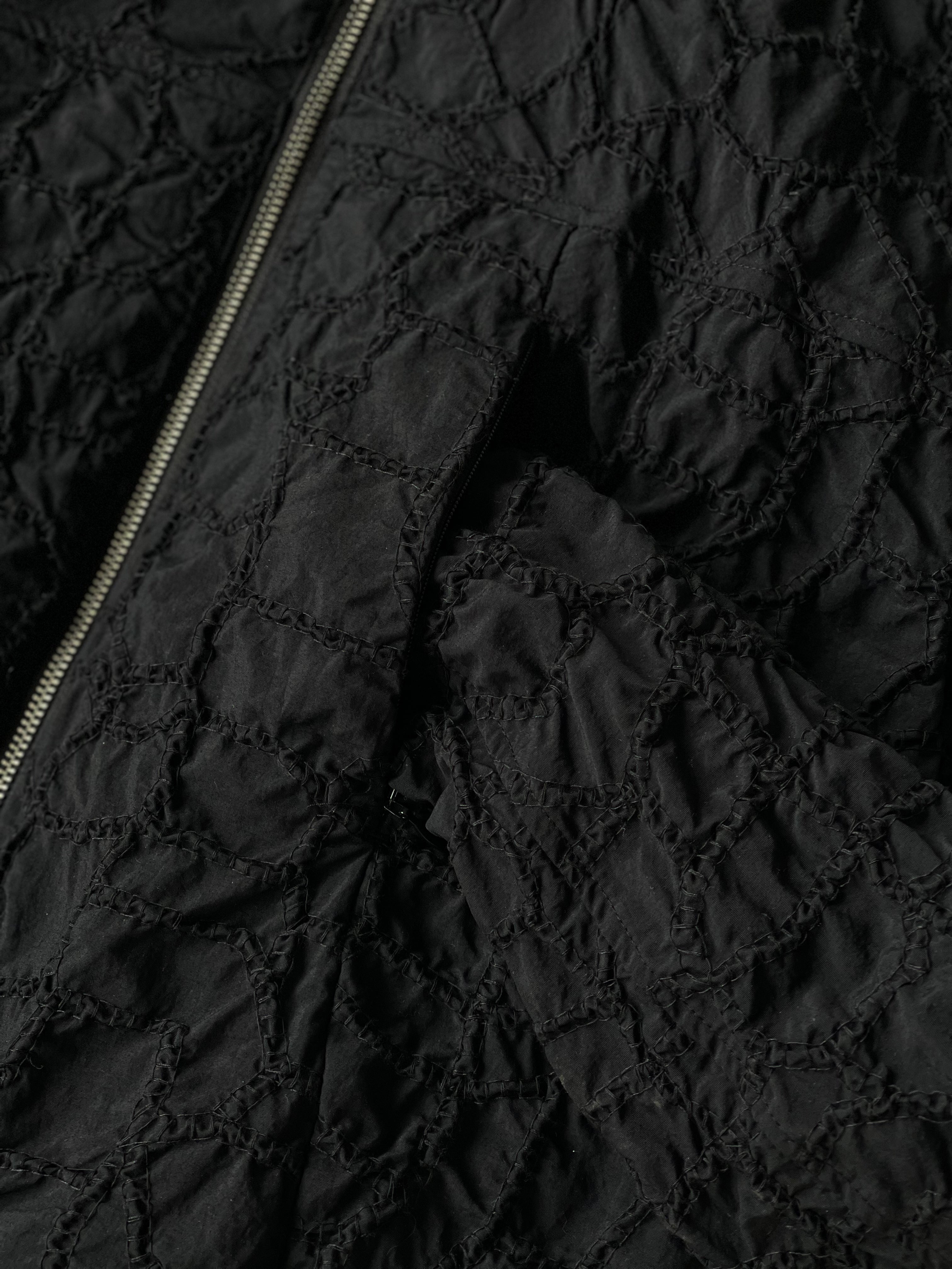 主素材→UVカット、軽量、撥水、透湿性が特徴のタスラン素材をベースに糸1つ1つが繋がり、格子状に構築された今シーズンのテーマを表現したオリジナル刺繍素材。