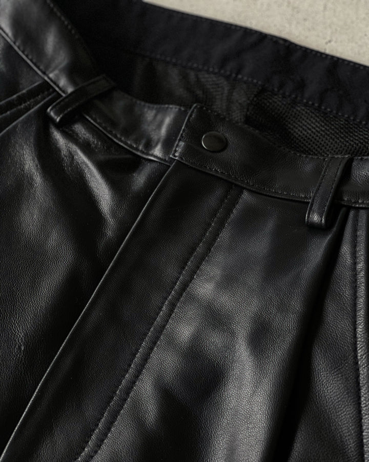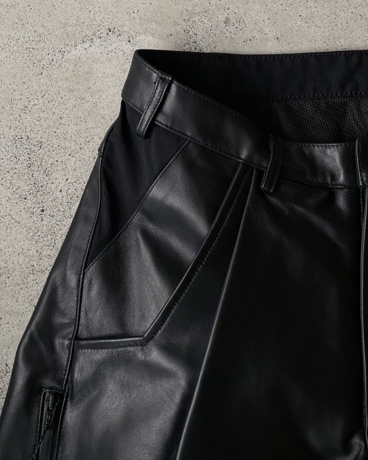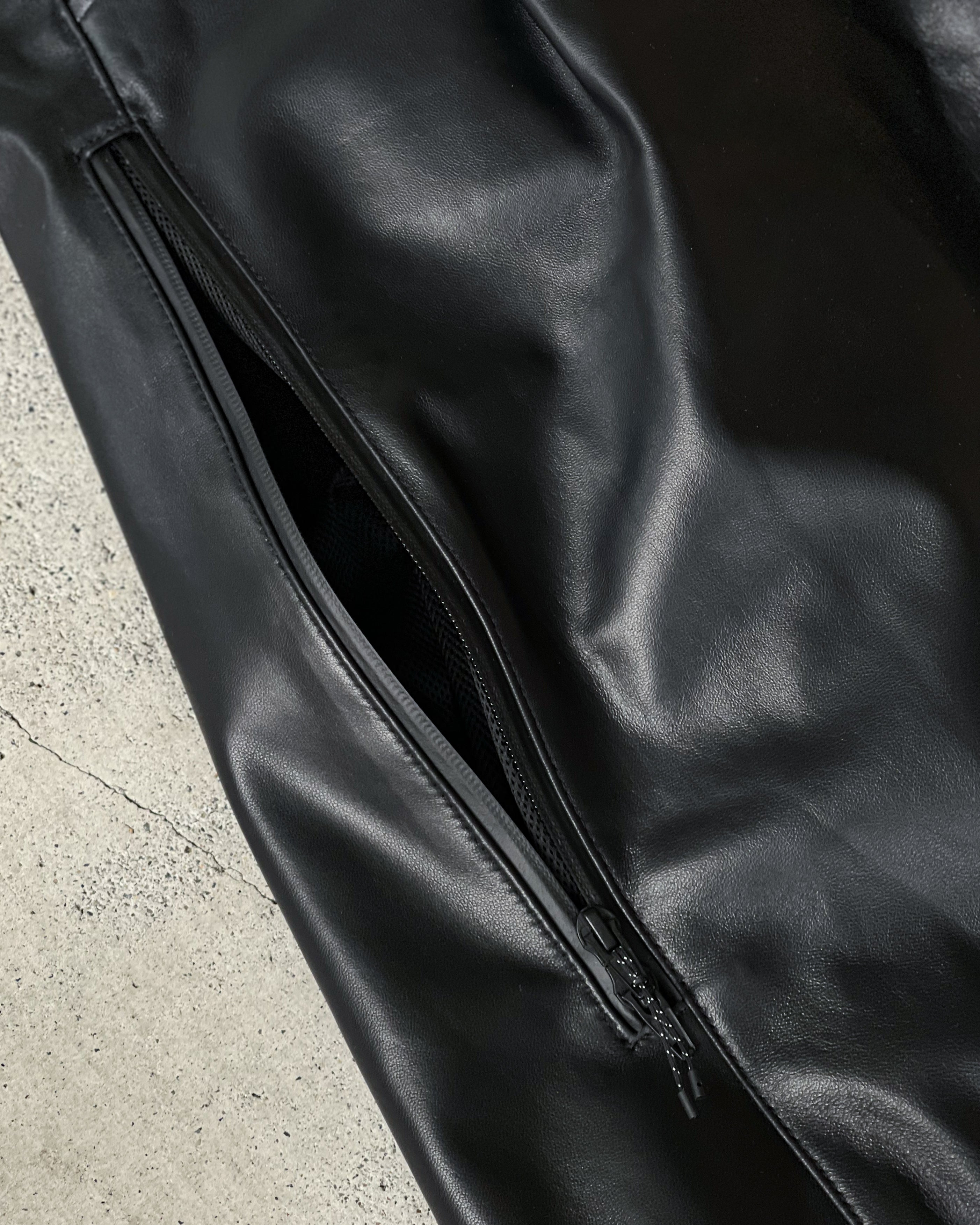 脇の止水ジップはポケット機能としても、ベンチレーションとしても活躍。レザー特有の蒸れ感の軽減を目的にスレキ箇所は全てメッシュ素材を使用しています。