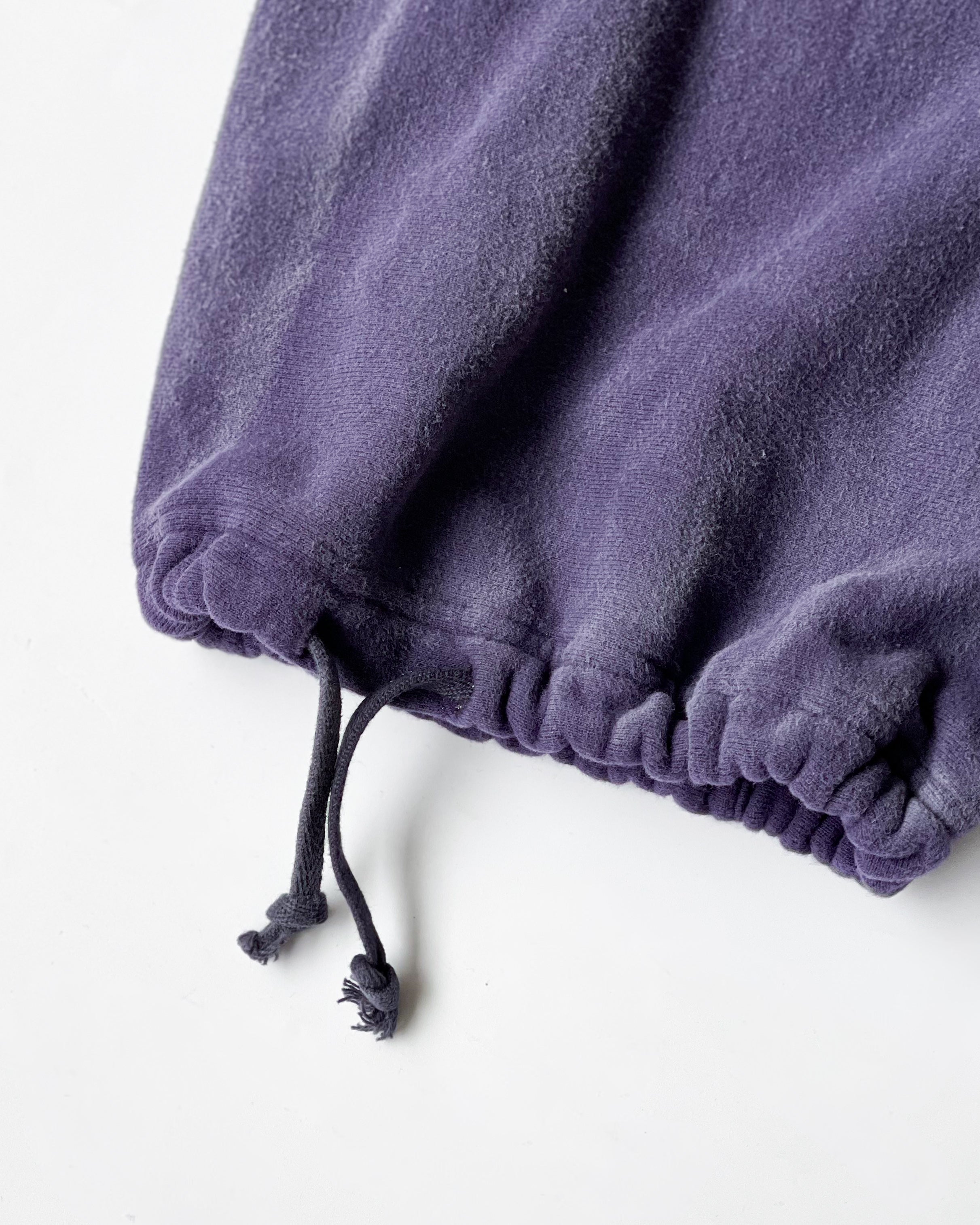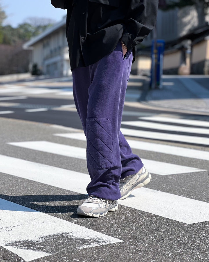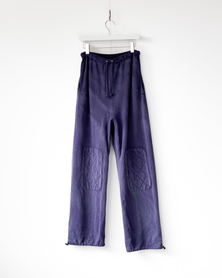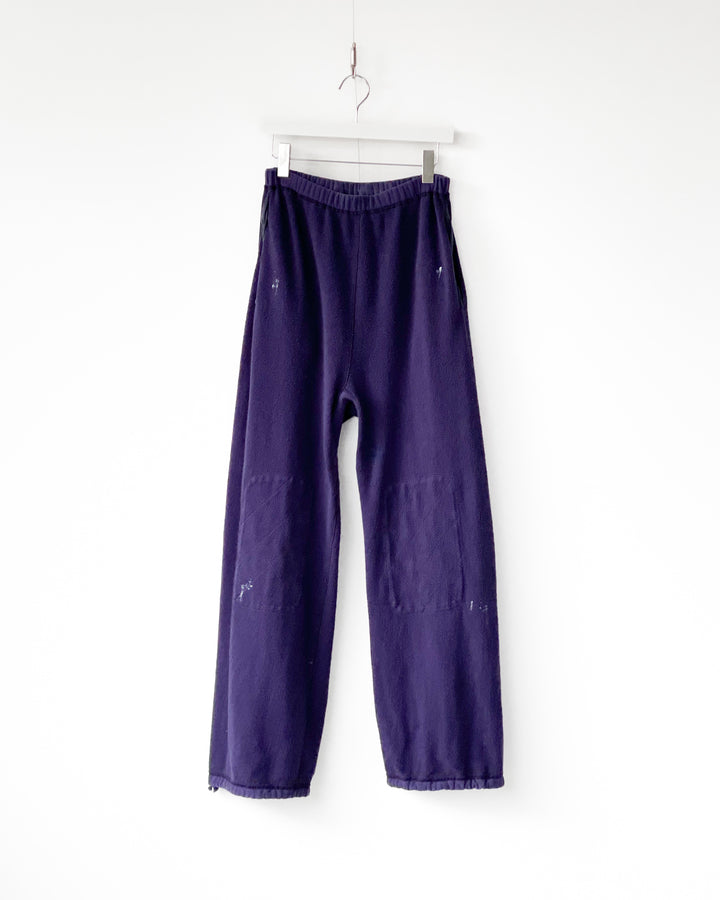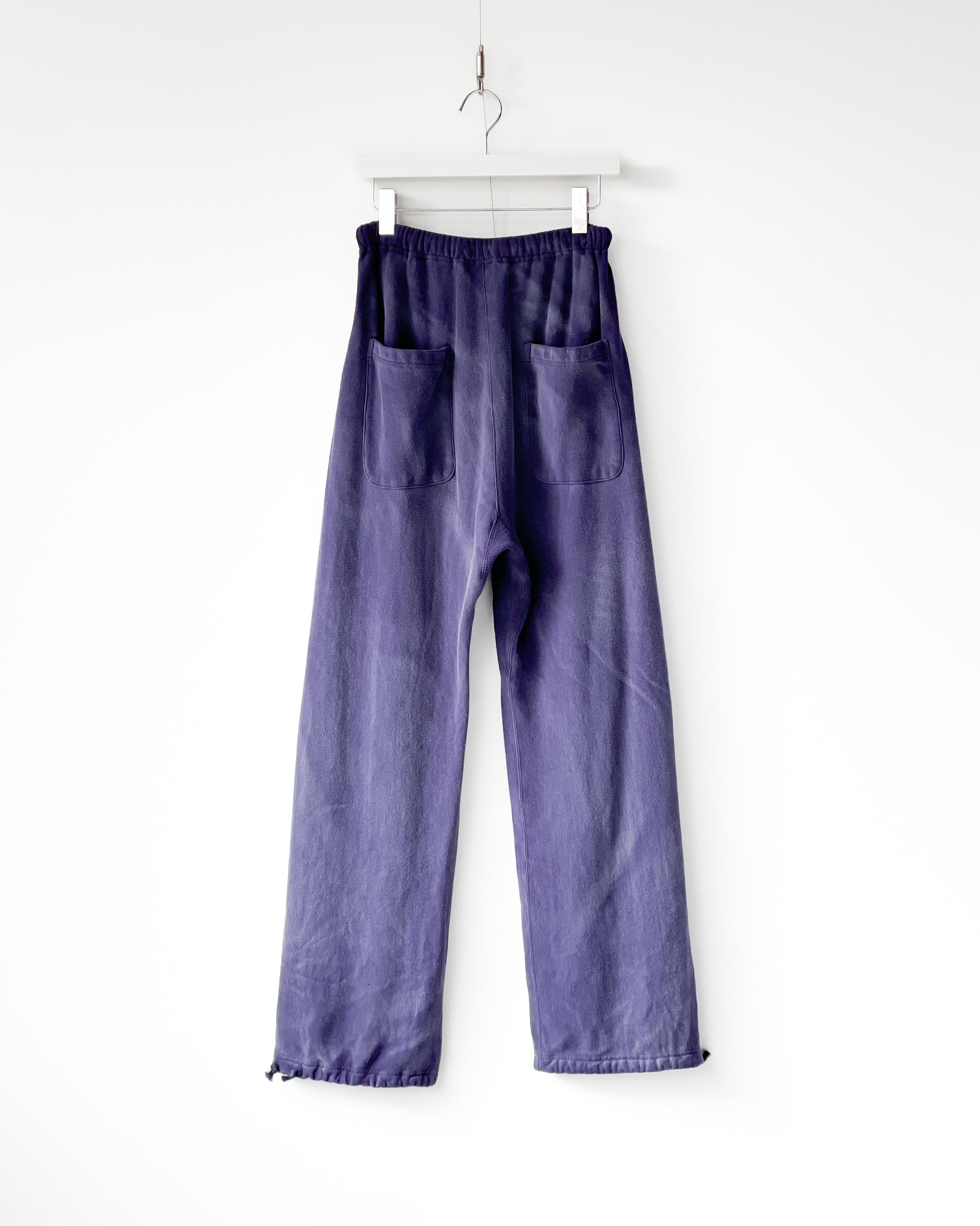 着古した様な風合いを表現する為に通常の加工工程を繰 り返し行なったスウェットパンツ。現場仕事で壁を塗る際は、裏返しで着用し、仕上げの際は表で着る事で、 壁に余計な汚れやムラがつかない様に配慮している。 その環境で着用されていたであろうヴィンテージ品をイメージし、表裏それぞれに異なる加工を施しています。リペアしたかの様につけられたニーパッチが特徴的なディテール。素材は低速で編み上げふっくらとした風合いに仕上げた裏毛を使用。シルエットはストレートシルエット。