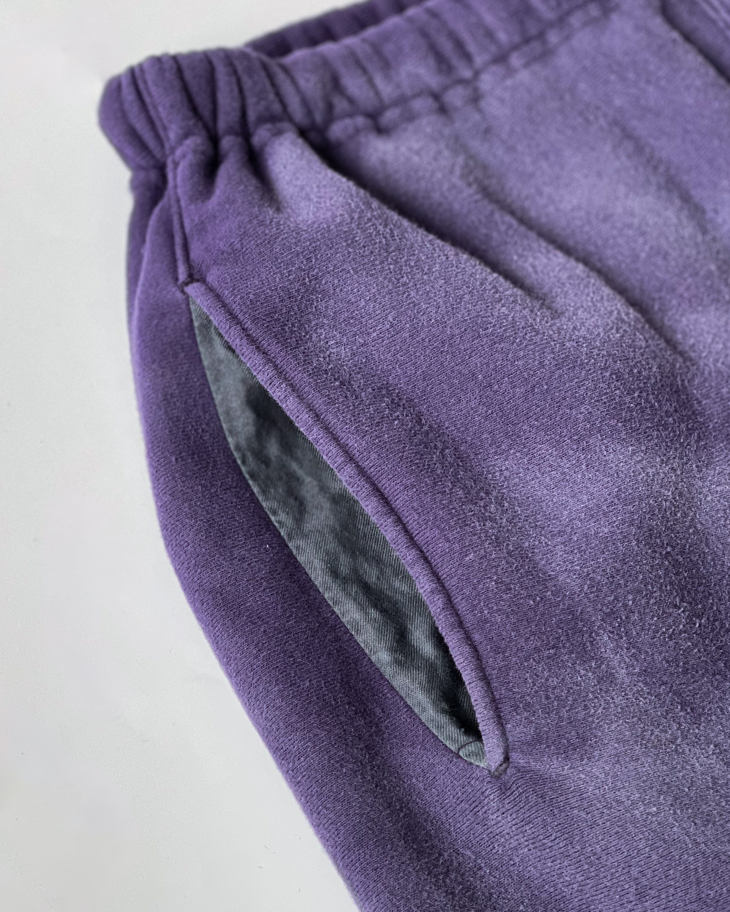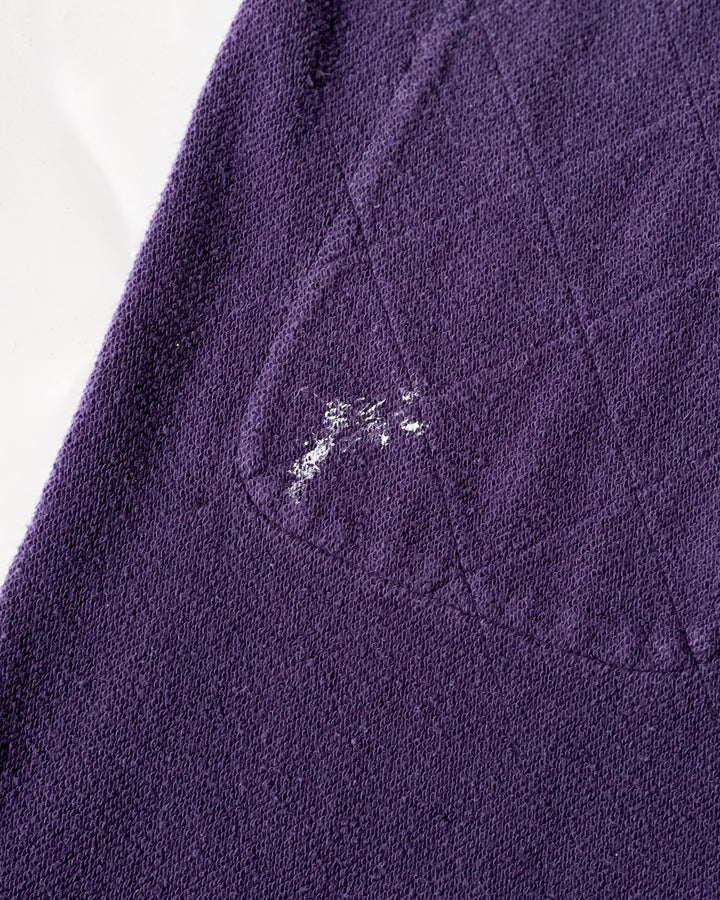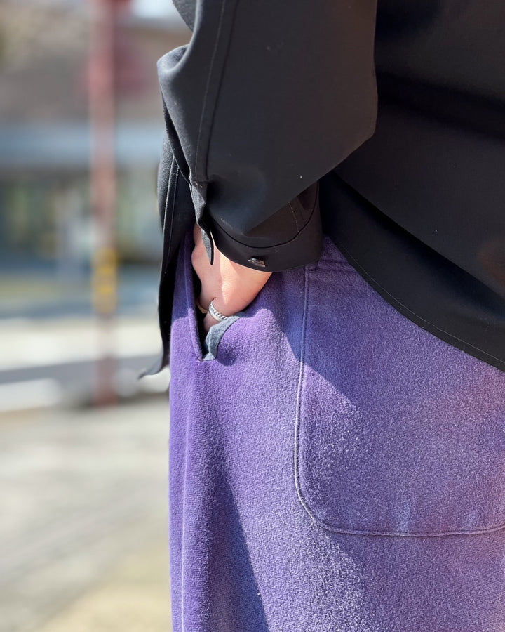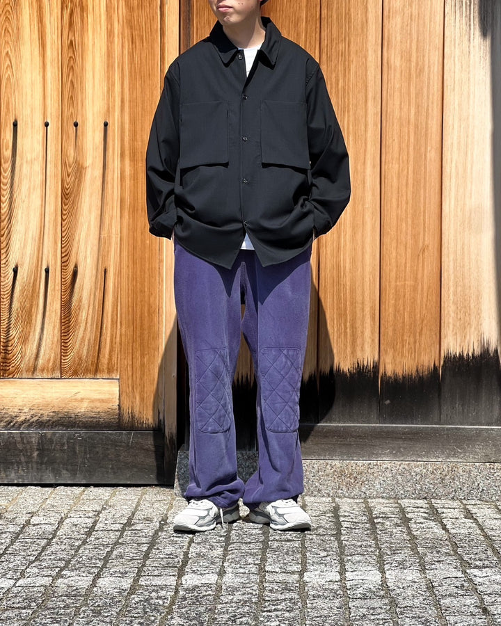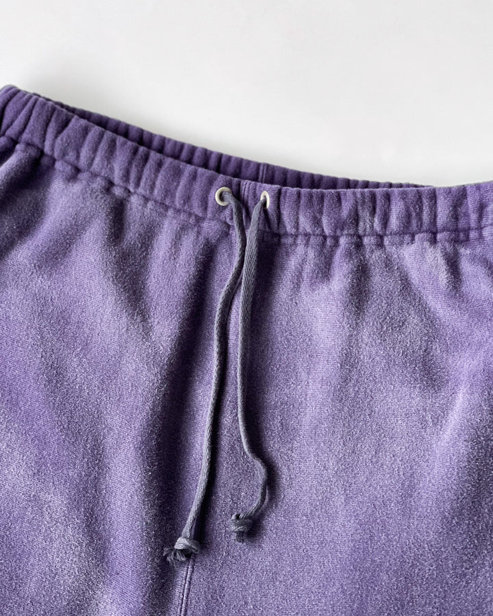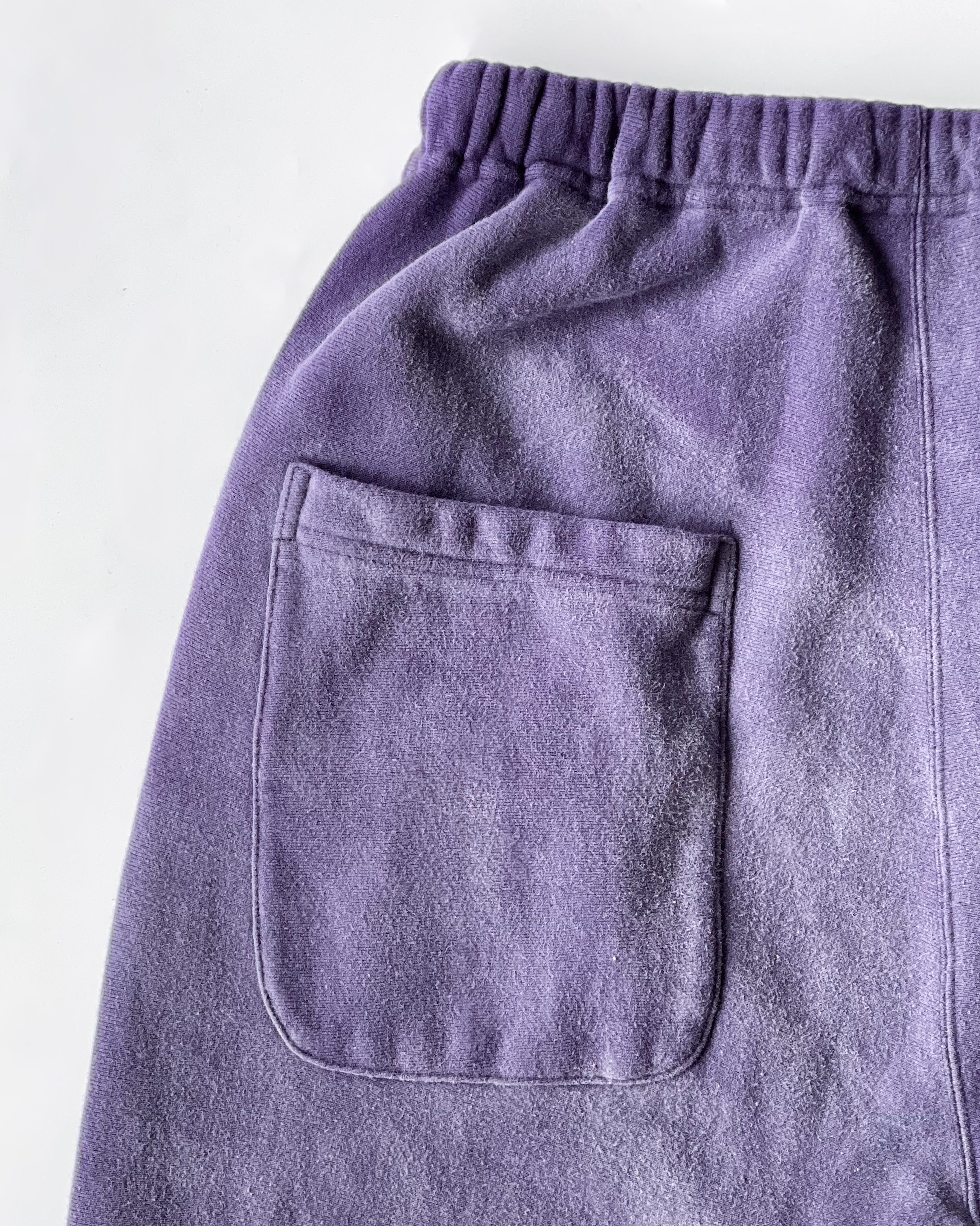 着古した様な風合いを表現する為に通常の加工工程を繰 り返し行なったスウェットパンツ。現場仕事で壁を塗る際は、裏返しで着用し、仕上げの際は表で着る事で、 壁に余計な汚れやムラがつかない様に配慮している。 その環境で着用されていたであろうヴィンテージ品をイメージし、表裏それぞれに異なる加工を施しています。リペアしたかの様につけられたニーパッチが特徴的なディテール。素材は低速で編み上げふっくらとした風合いに仕上げた裏毛を使用。シルエットはストレートシルエット。
