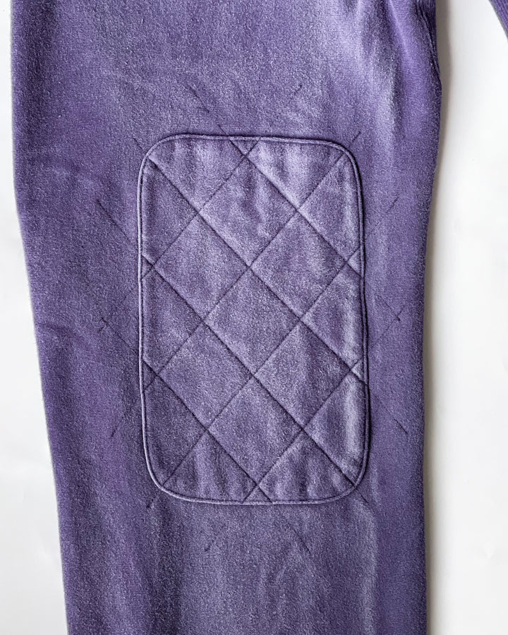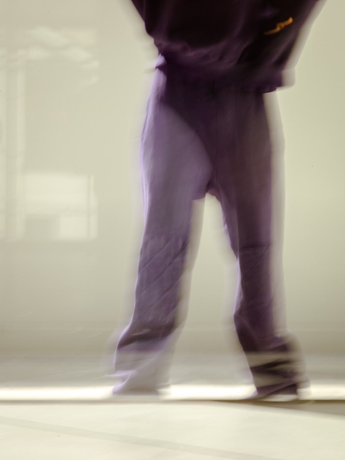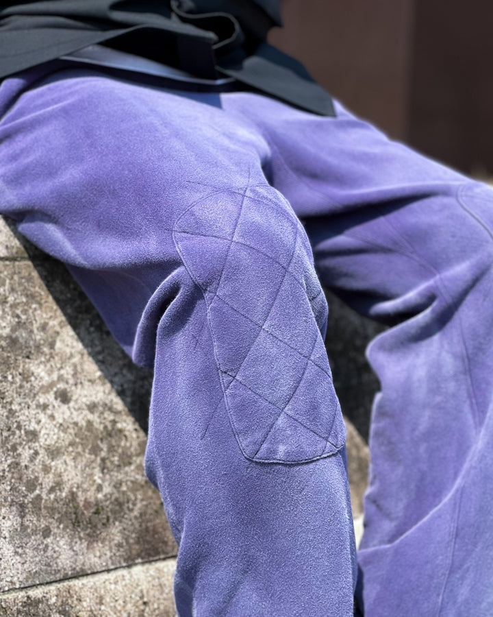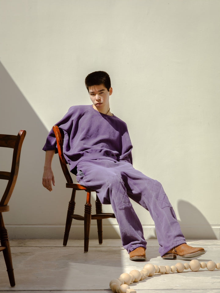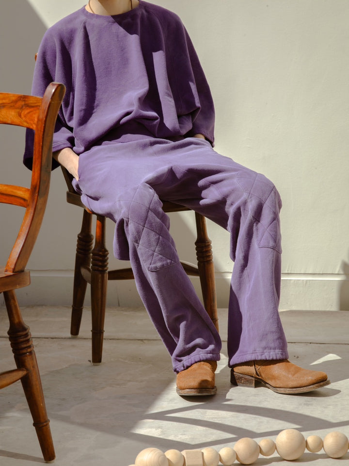 着古した様な風合いを表現する為に通常の加工工程を繰 り返し行なったスウェットパンツ。現場仕事で壁を塗る際は、裏返しで着用し、仕上げの際は表で着る事で、 壁に余計な汚れやムラがつかない様に配慮している。 その環境で着用されていたであろうヴィンテージ品をイメージし、表裏それぞれに異なる加工を施しています。リペアしたかの様につけられたニーパッチが特徴的なディテール。素材は低速で編み上げふっくらとした風合いに仕上げた裏毛を使用。シルエットはストレートシルエット。