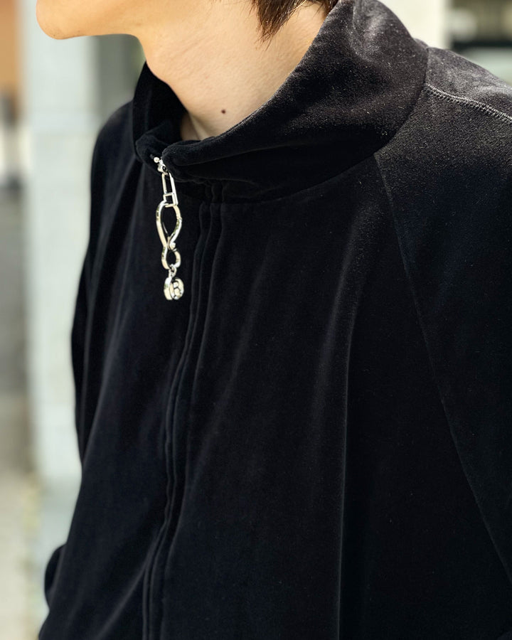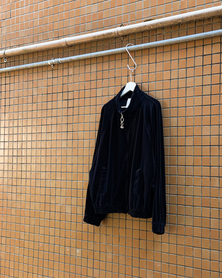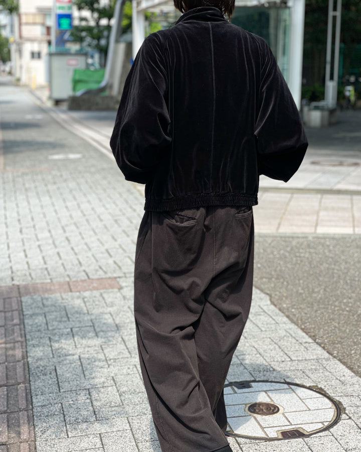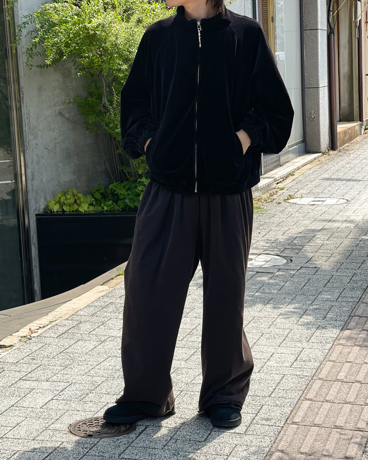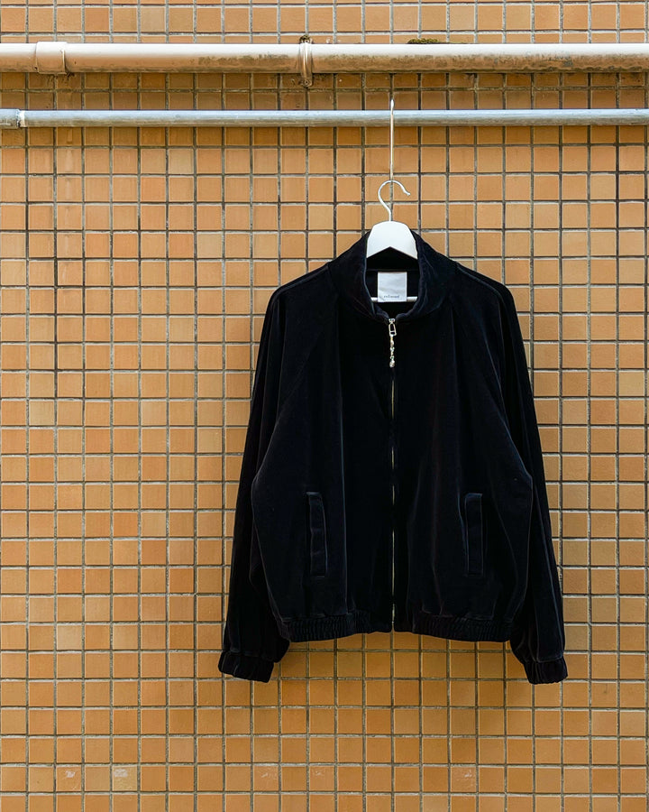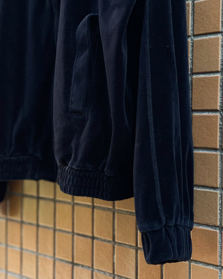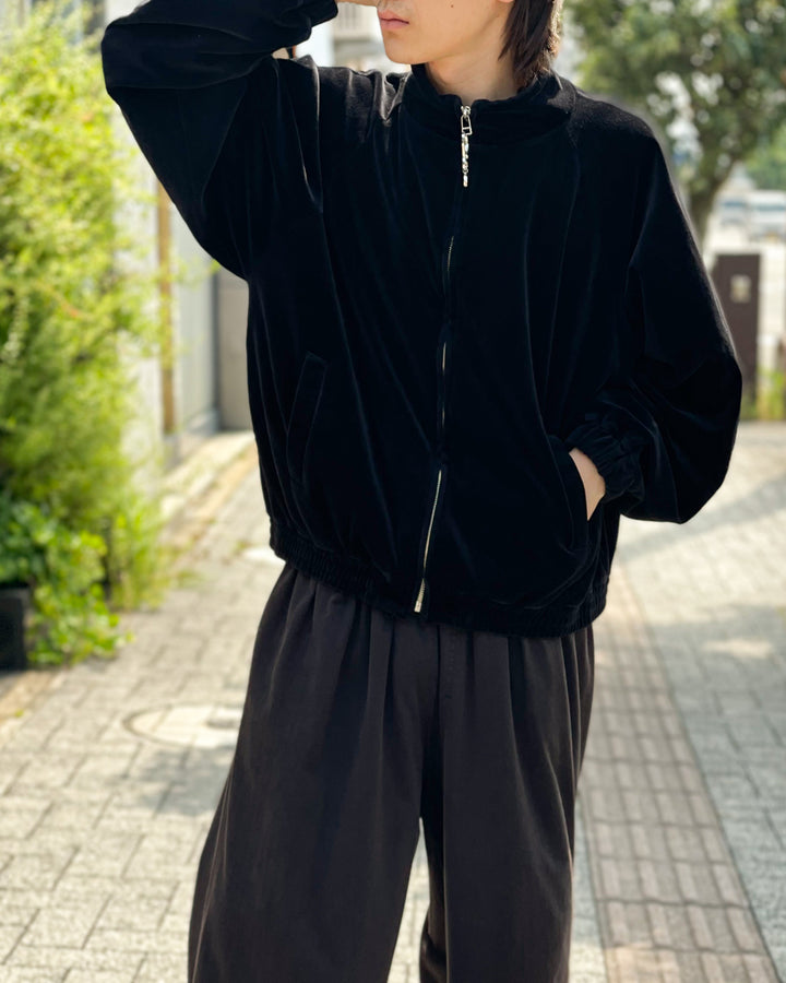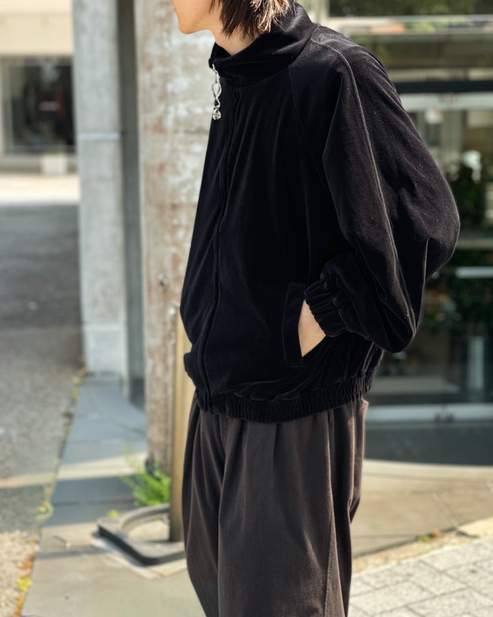 コットンベロアを光沢がなくなるまで洗い込み、ヴィンテージさながらの風合いに仕上げたトラックジャケット。別珍のスーベニアジャケットのような素材感で良い雰囲気が漂います。