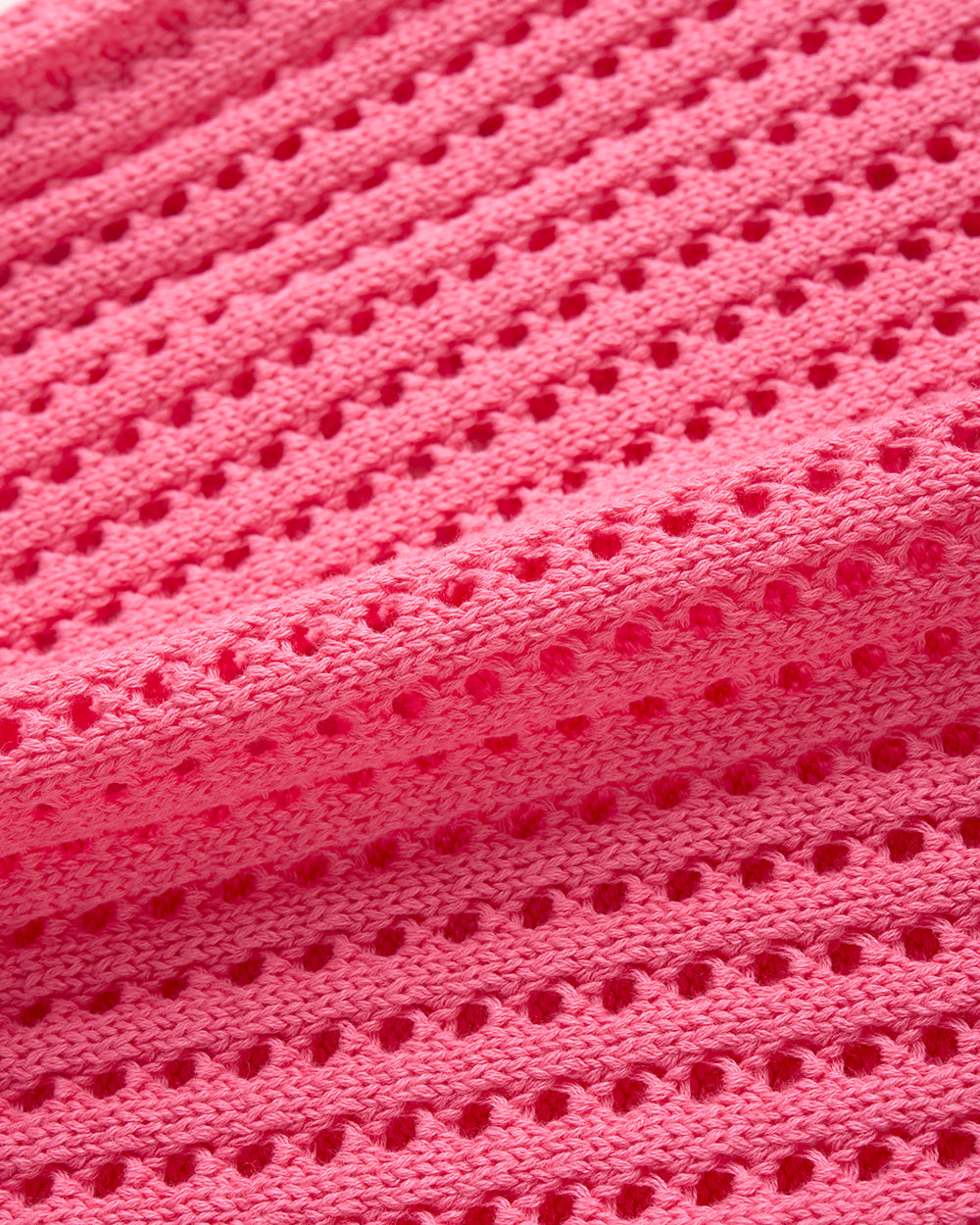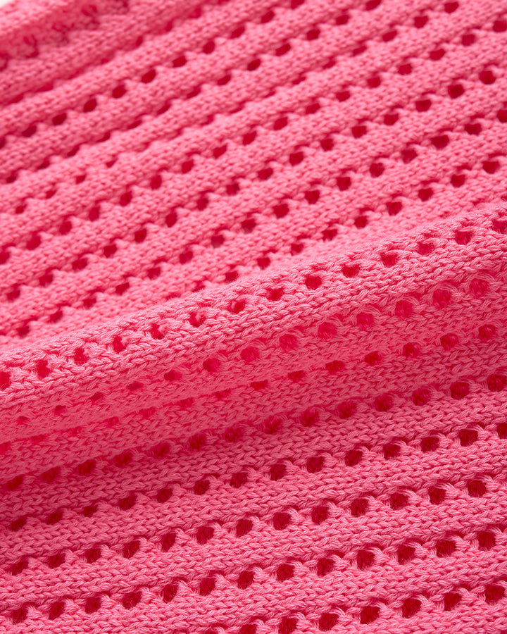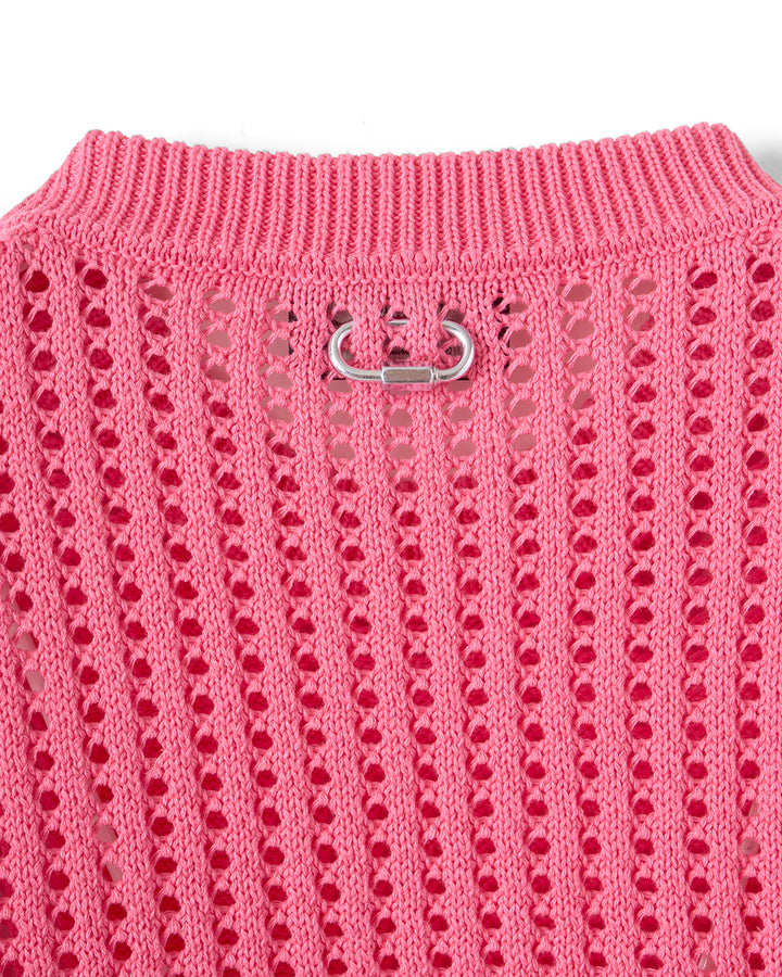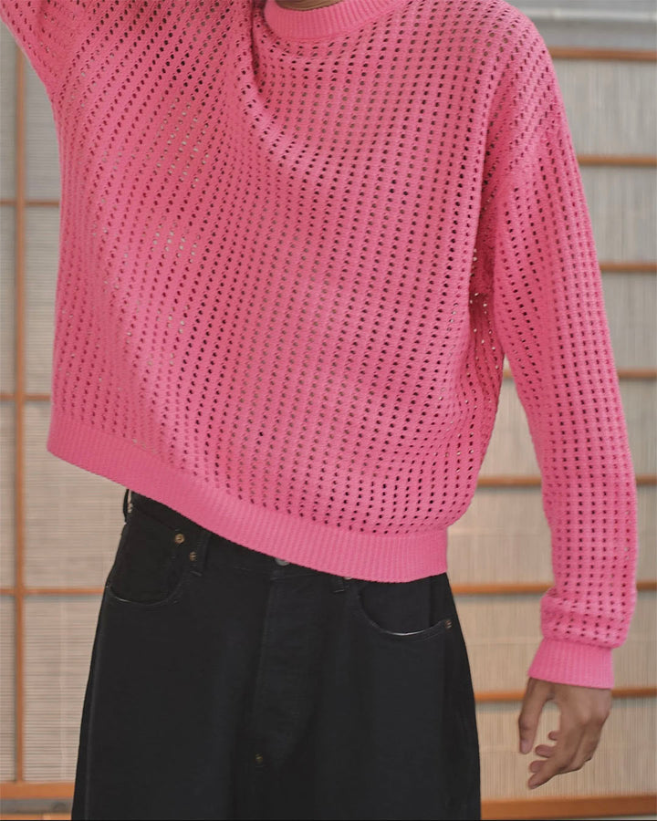 作業現場で使用される安全帯から着想を得てデザインされたメッシュニットセーター。背中部分に付けられたカラビナが良いアクセントに。糸にはクリンプ性の高いコットン糸を使用しており、軽くて膨らみのある表情が特徴的。