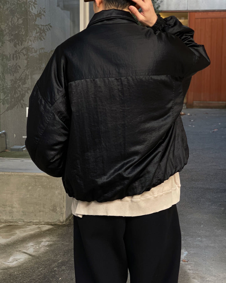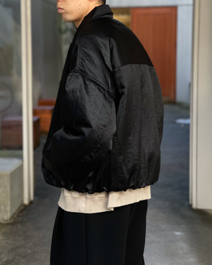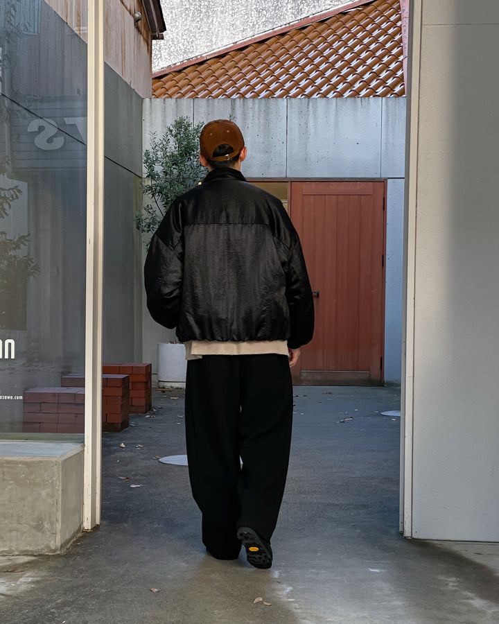 歴史的ワークウエアの様々なディテールを取り除いた一着。ナイロンサテンにコーティングを施し、タンブラー加工によってヴィンテージ感のある光沢を表現。左胸にはrefomedの象徴ともいえるゴムディテールで表現したタグを配し、アイコニックなアクセントを加えています。