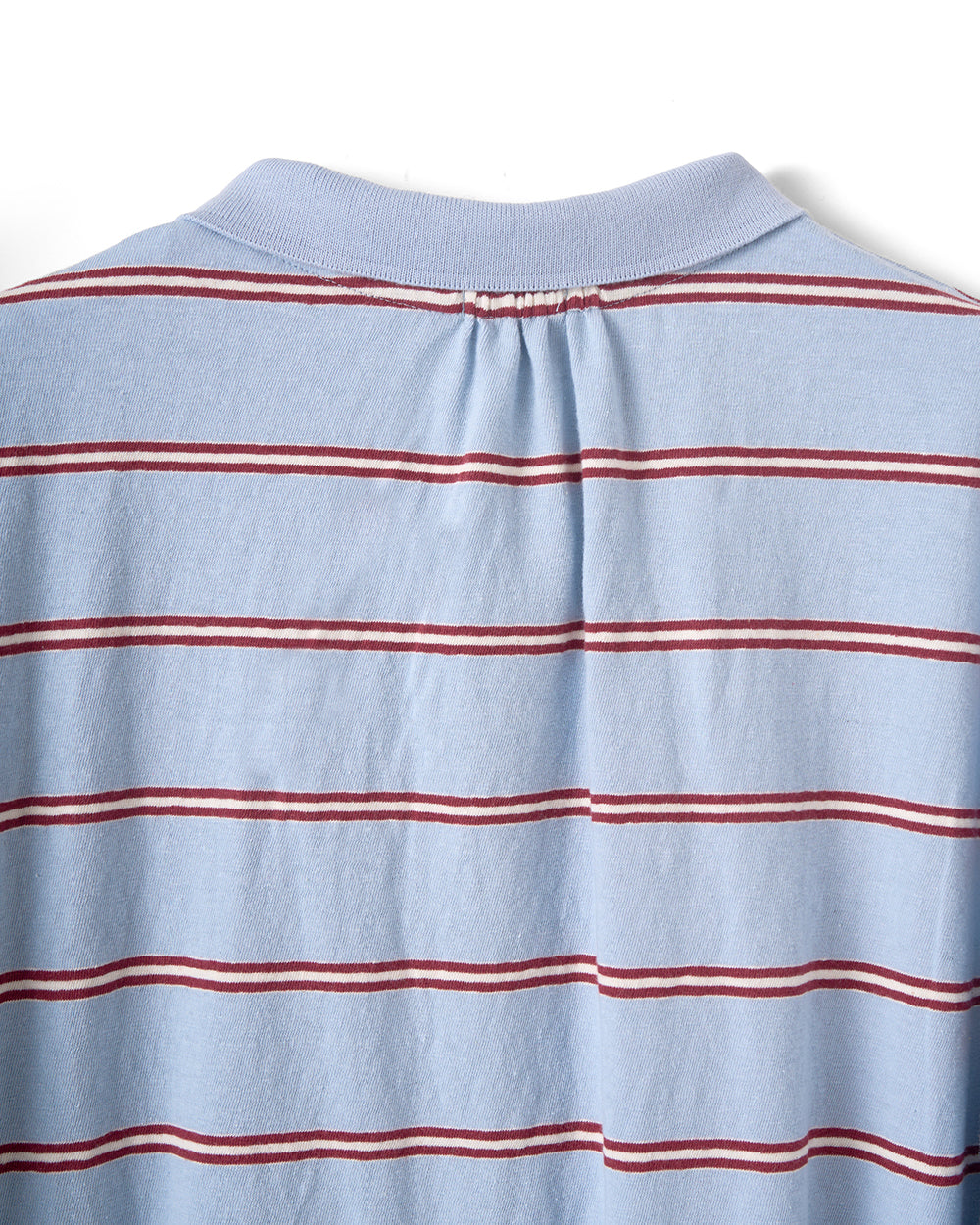 作業現場の中では正装着であるポロシャツ。祖父が着用しているのをイメージし製作いたしました。 釜底から裾にかけての微妙な差寸設計により、 自然な丸みと落ち感のあるシルエットが生まれました。 生地はスラブ糸を使用したボーダー天竺。アイコンディテールである背中のギャザーが特徴的。