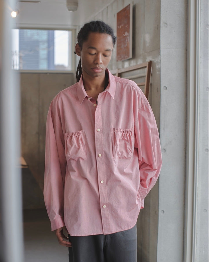 肩を落としたワイドシルエットに加え、背中に施した4タックが生み出す立体的なボリュームも一枚で着た際に良い雰囲気を演出してくれます。アウター並みに広めに設定したアームホールは健在なので、スウェットやニットの上に重ねていただくのもおすすめです。