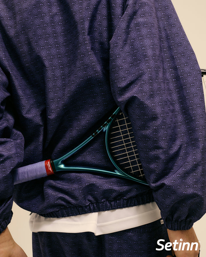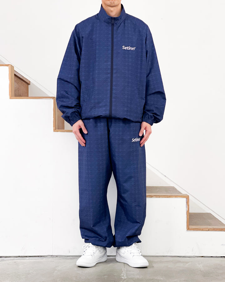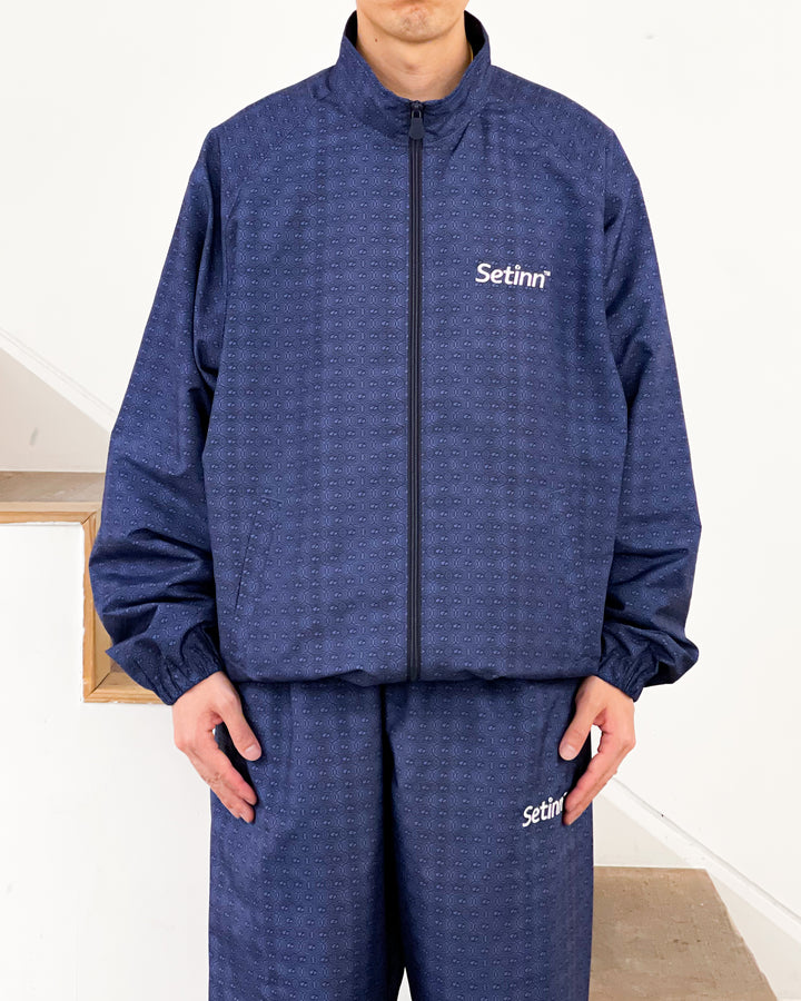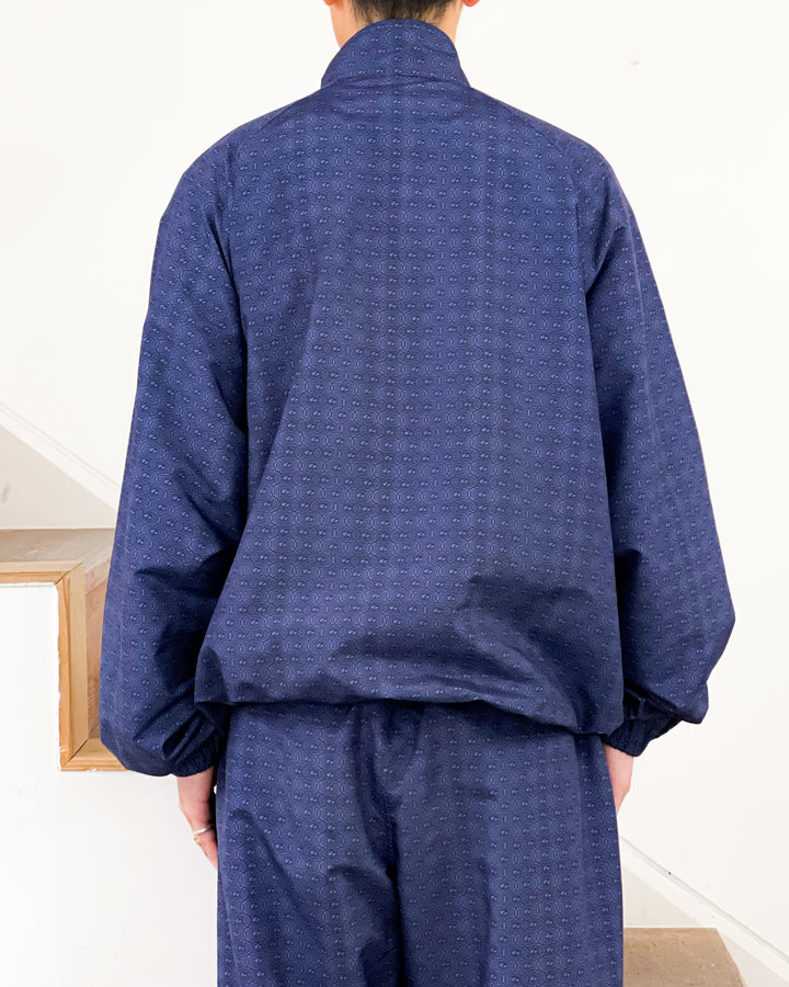 総柄プリントを施したオリジナル生地のフルジップ型トレーニングジャケット。