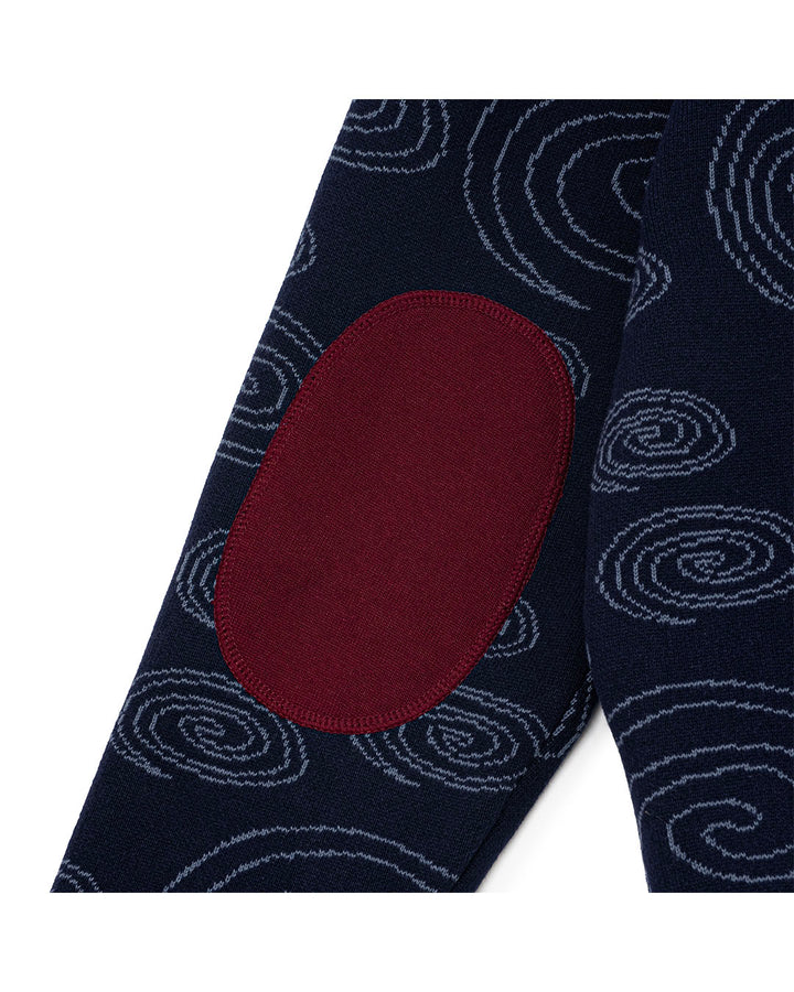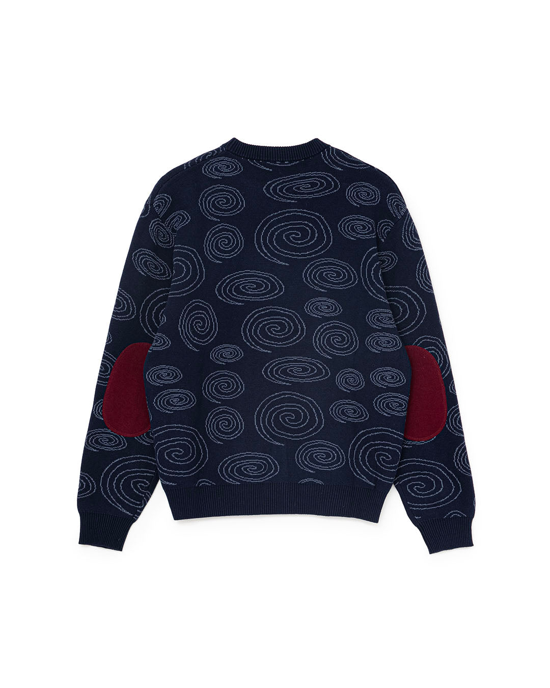 GuruGuruのアウトライングラフィクを総柄で使用したクルーネックニット。アクセントカラーのエルボーパッチ付き。