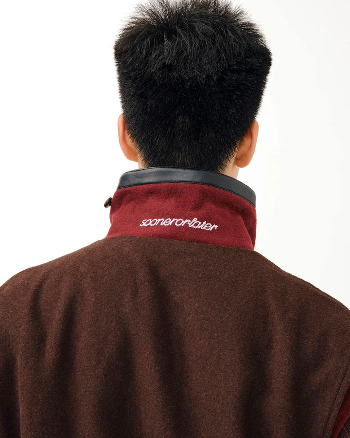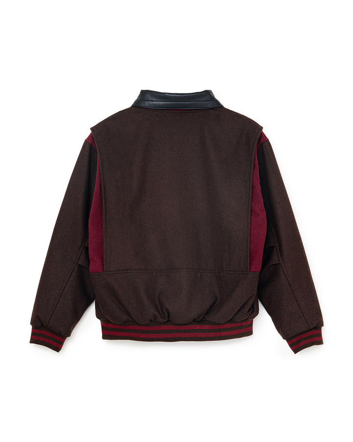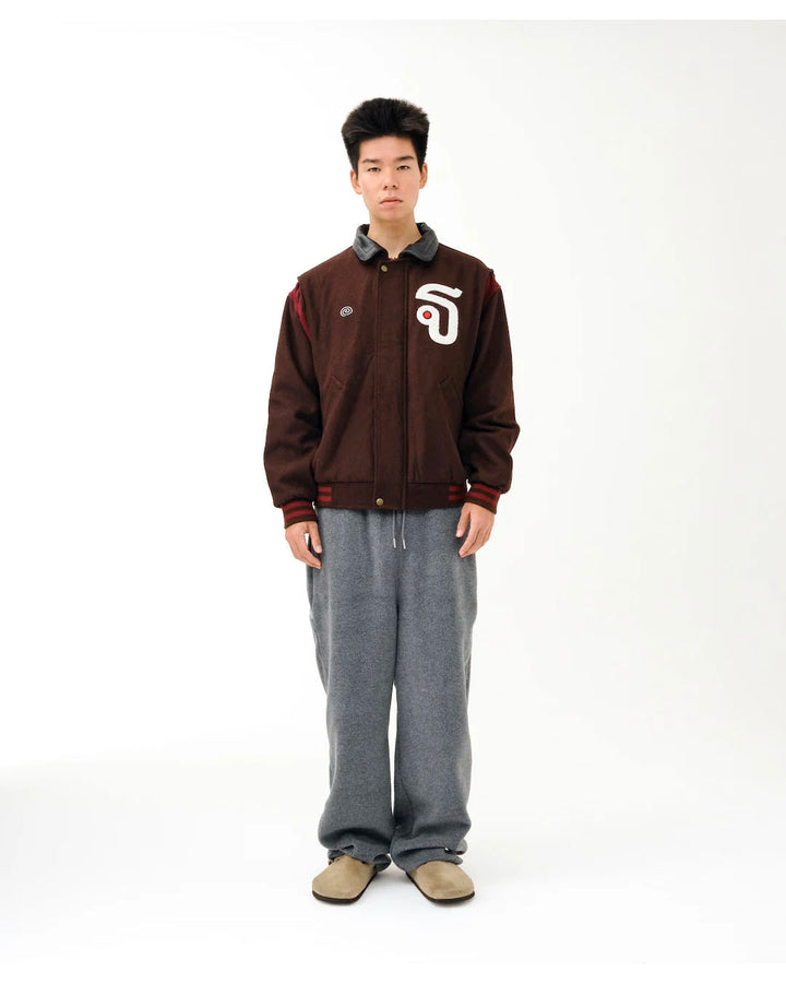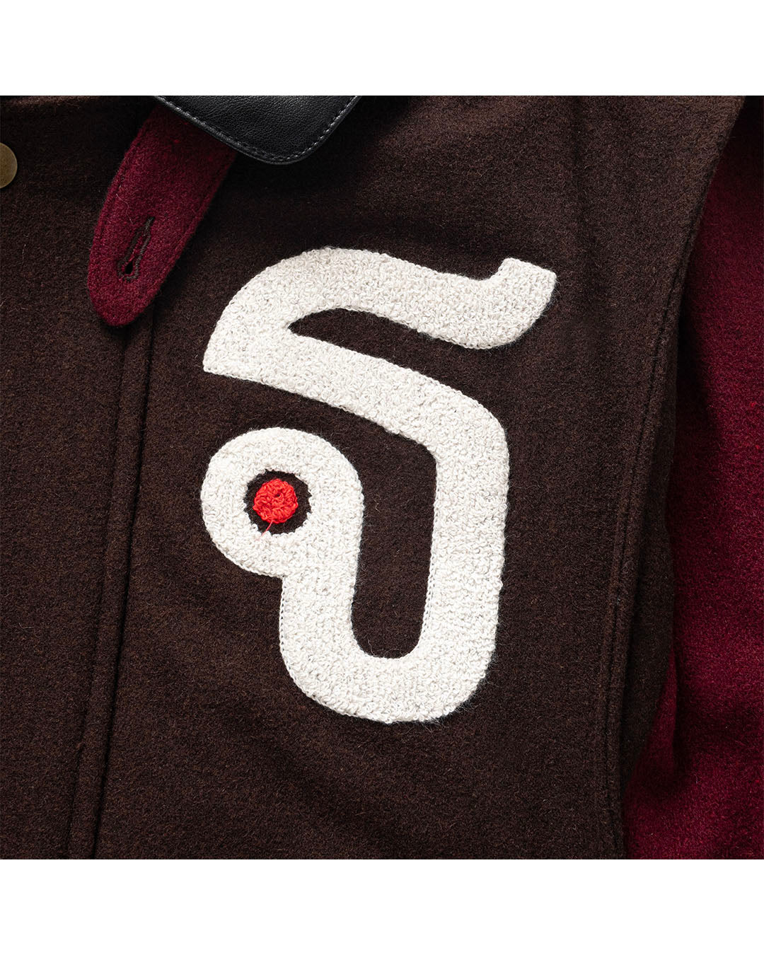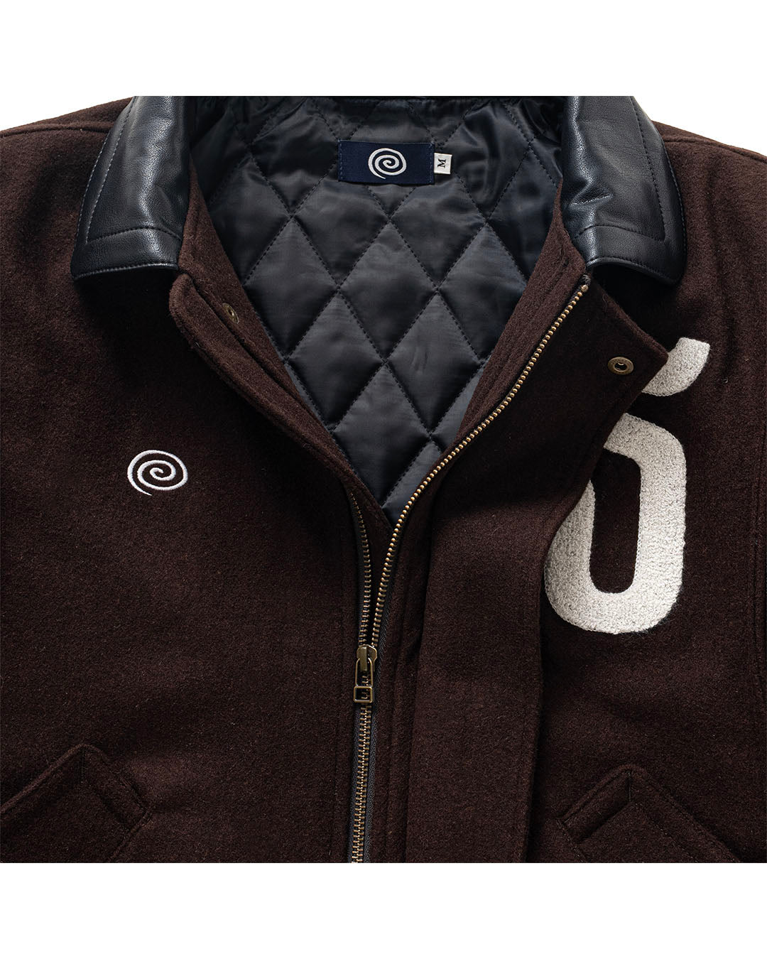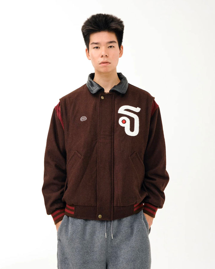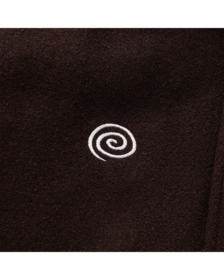 THAI LOGOのサガラ刺繍ワッペン、GuruGuru刺繍をフロントにデザイン。首裏には筆記体ロゴをチェーンステッチ刺繍。襟はチンストでスタンドカラーとしても使用可能。