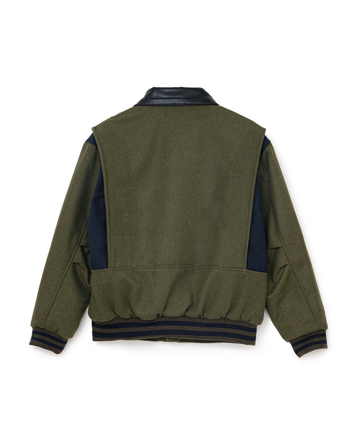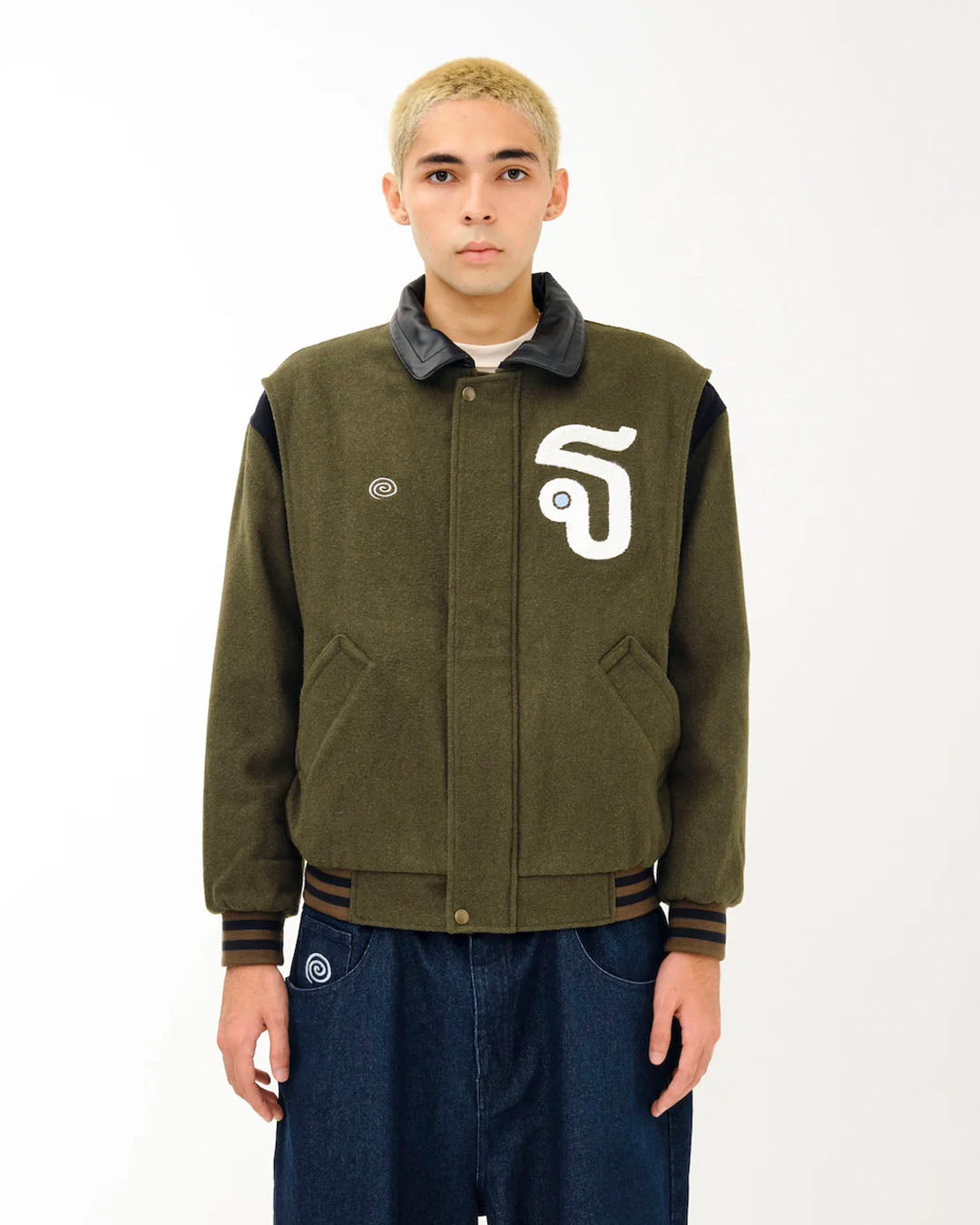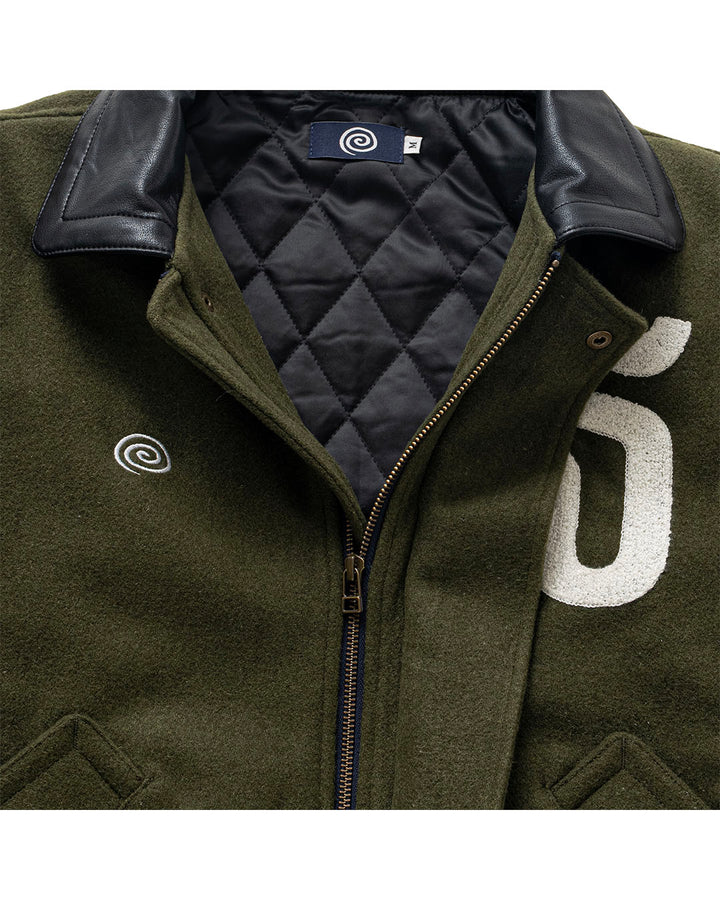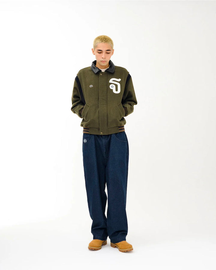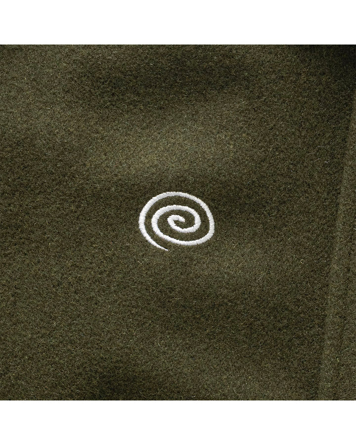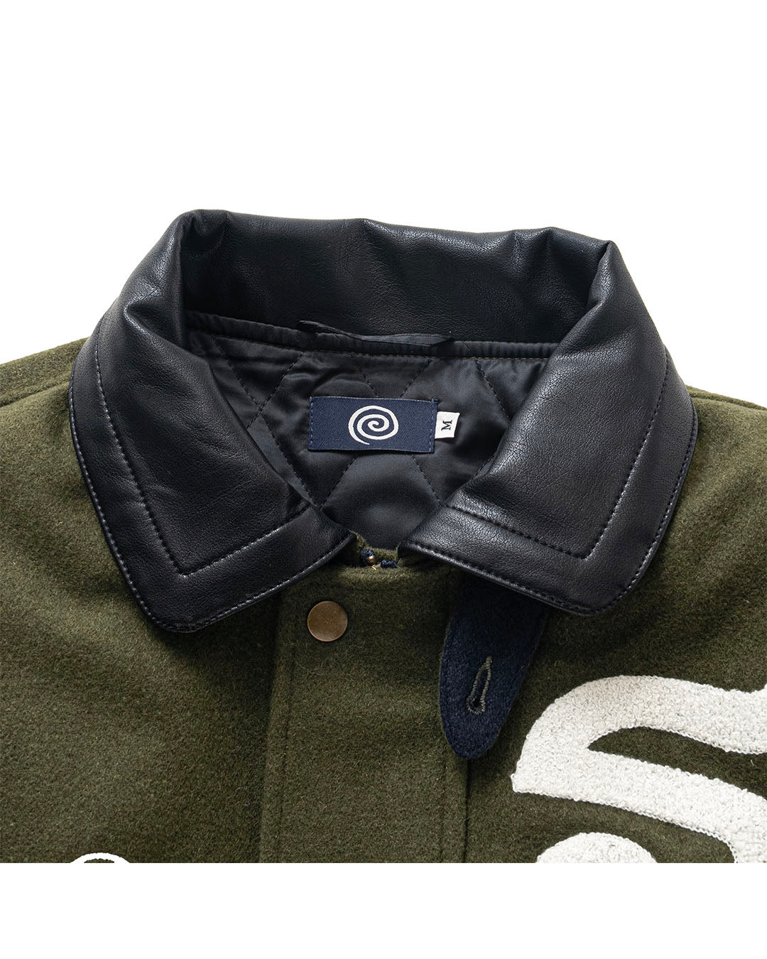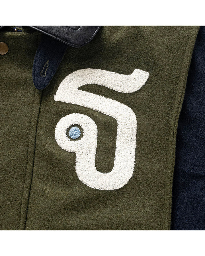 THAI LOGOのサガラ刺繍ワッペン、GuruGuru刺繍をフロントにデザイン。首裏には筆記体ロゴをチェーンステッチ刺繍。襟はチンストでスタンドカラーとしても使用可能。