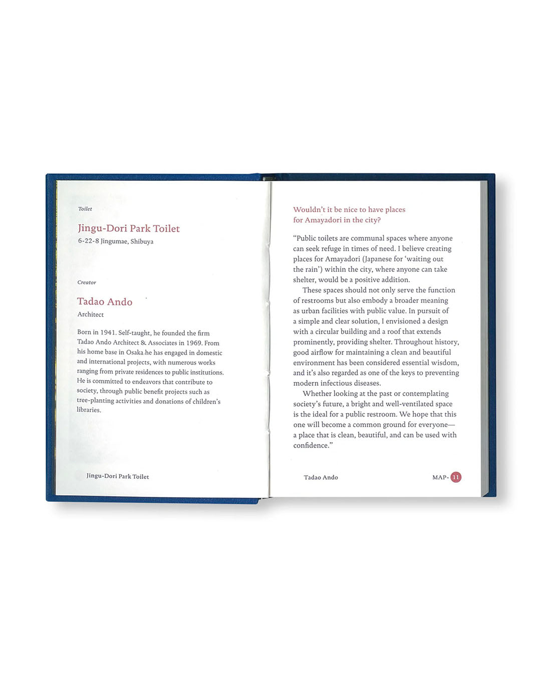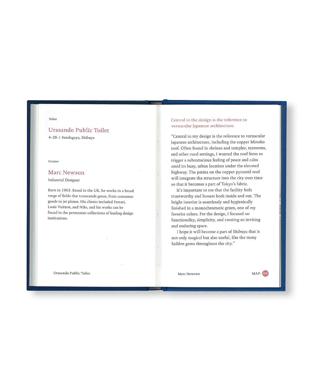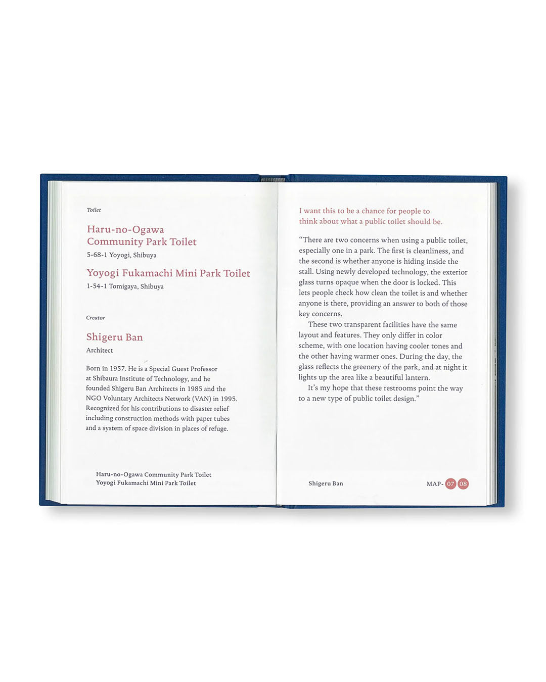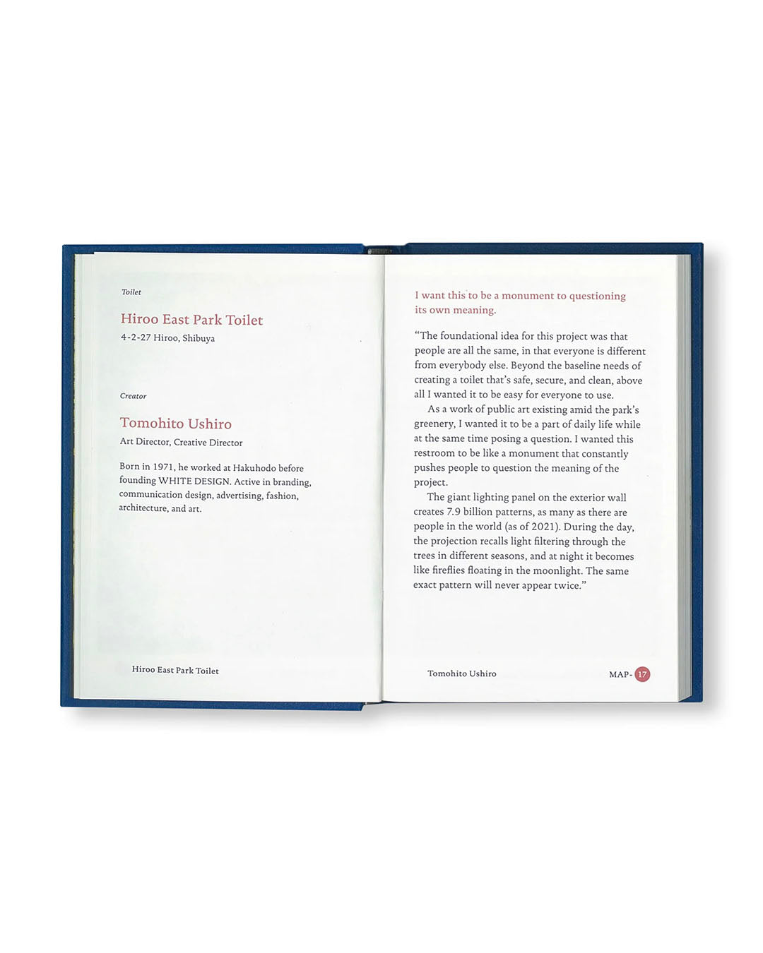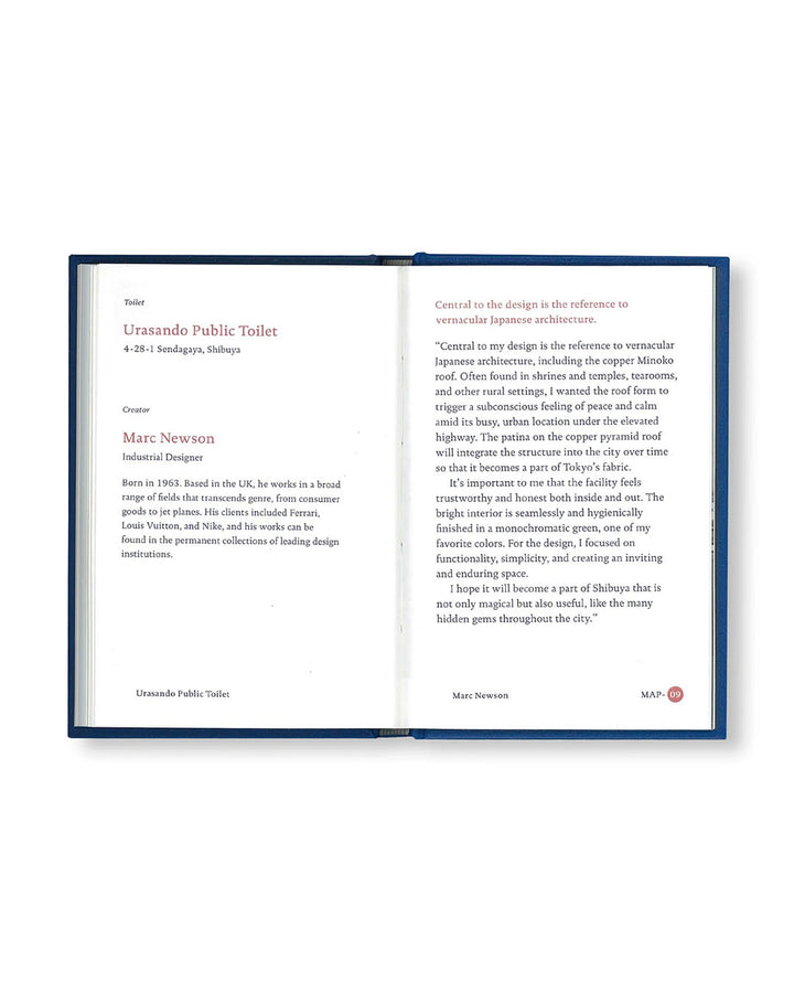 世界で活躍する16人のクリエイターによる見たことのないような公共トイレが東京・渋谷に出現した。都市の中に佇むあまやどりの場所、降り立った宇宙船のようなトイレ、タコ公園に建てられたイカのようなトイレなど、どれも見たことのないようなトイレである。そしてそれは映画『PERFECT DAYS』の舞台にもなった。監督のヴィム・ヴェンダース(Wim Wenders)はこの〈THE TOKYO TOILET〉を「忙しい東京の中の、静かな場所」と表現した。 その〈THE TOKYO TOILET〉が写真家・高橋ヨーコの手によって「The Tokyo Toilet Book」として一冊の本にまとめられた。彼女が思いを込めて切り取った17箇所の〈THE TOKYO TOILET〉の記録は、チャーミングな新しい東京の風景として、きっと、記憶されるものになるであろう。