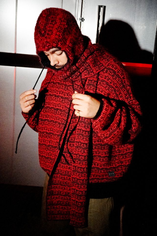フリーサイズ、リバーシブルで使用可能なニットフーディー。TTTらしいスタイルのマストアイテム。