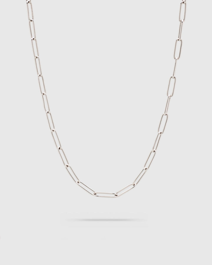 このチェーンはポリッシュ仕上げのスターリングシルバー925製で、表面を強化し変色を防ぐためにホワイトロジウムプレーティングが施されています。
