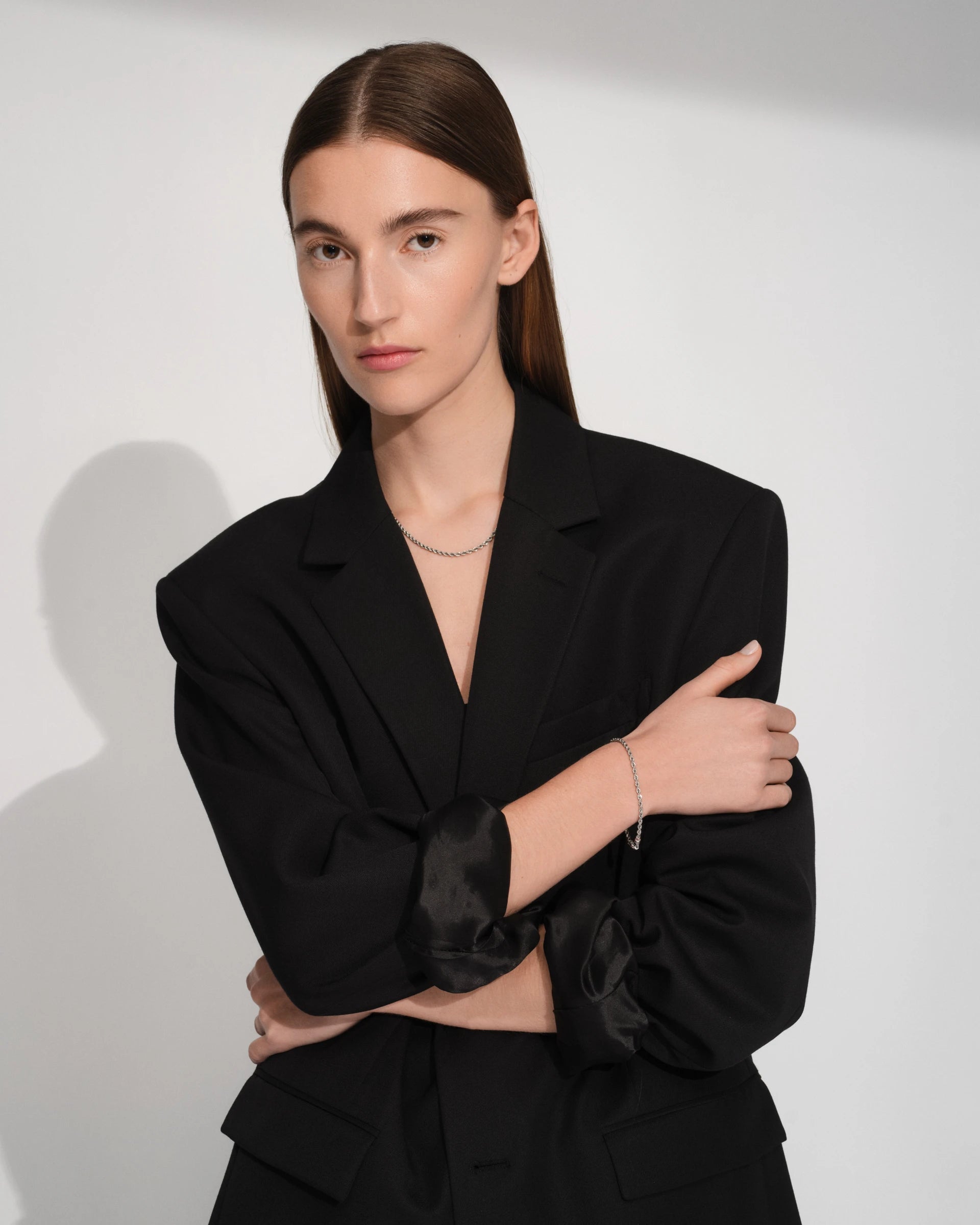 ポリッシュ仕上げのリサイクル・スターリングシルバー925を使用し、表面を強化し変色を防ぐためにホワイト・ロジウムメッキを施しています。